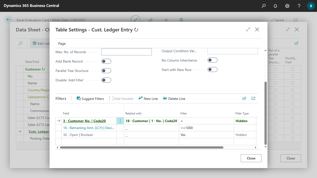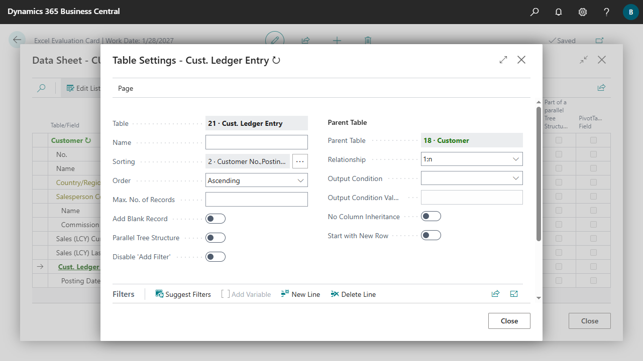 The Suggest Filters action can be used to suggest fields of the table and related fields between the table and the parent table. Existing filters will not be overwritten or changed.