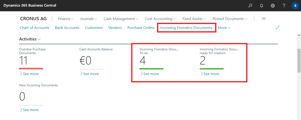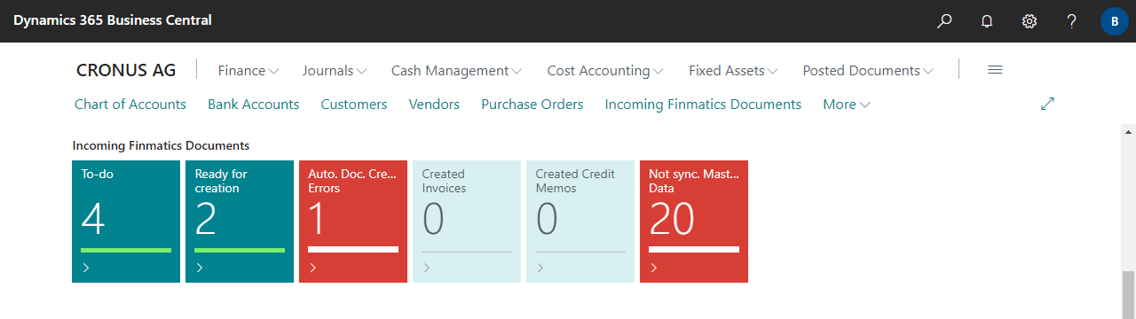 | Ready for creation | Specifies the number of incoming Finmatics Documents ready for creation in Business Central. Documents are either uploaded manually to Finmatics or transferred via other means (email, web scan, mobile app, etc.). Once all fields are captured and/or predicted, and if no discrepancies are detected, documents are automatically ready for creation. For more information, see Working with the App, Incoming Finmatics Documents. |