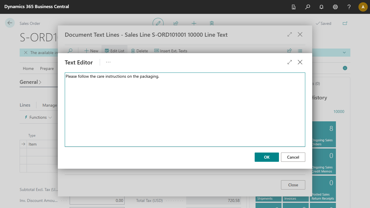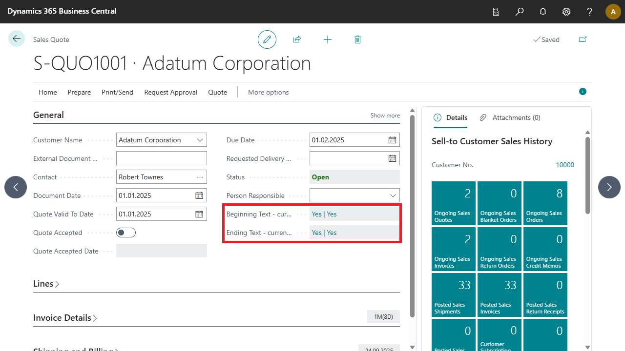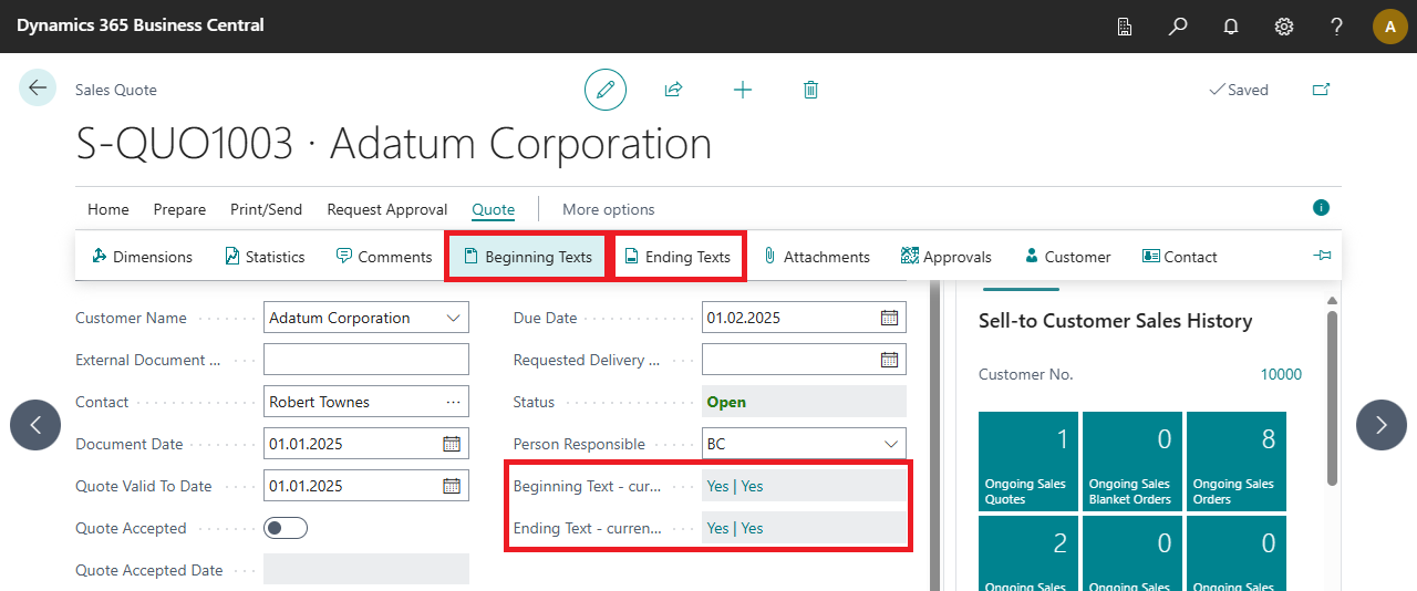 Beginning and Ending Texts Beginning and ending texts are Extended Texts that are automatically inserted before or after the document lines. They appear in sales, purchase, service, or job documents. Use these texts for notes, legal information, or individual messages to your customers...