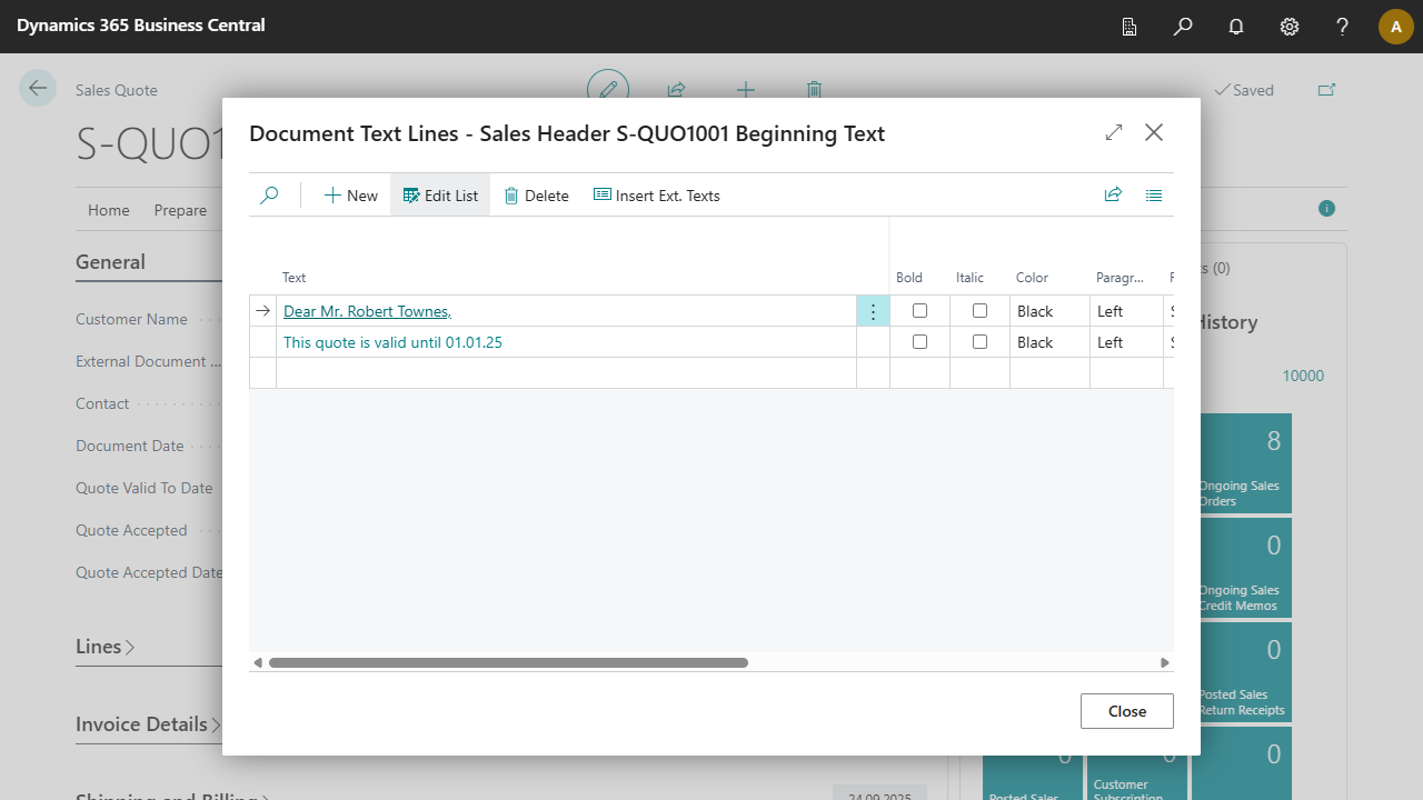 The functions Make Order and Make Invoice in a Sales Quote have not applied the formatting of the document text lines.