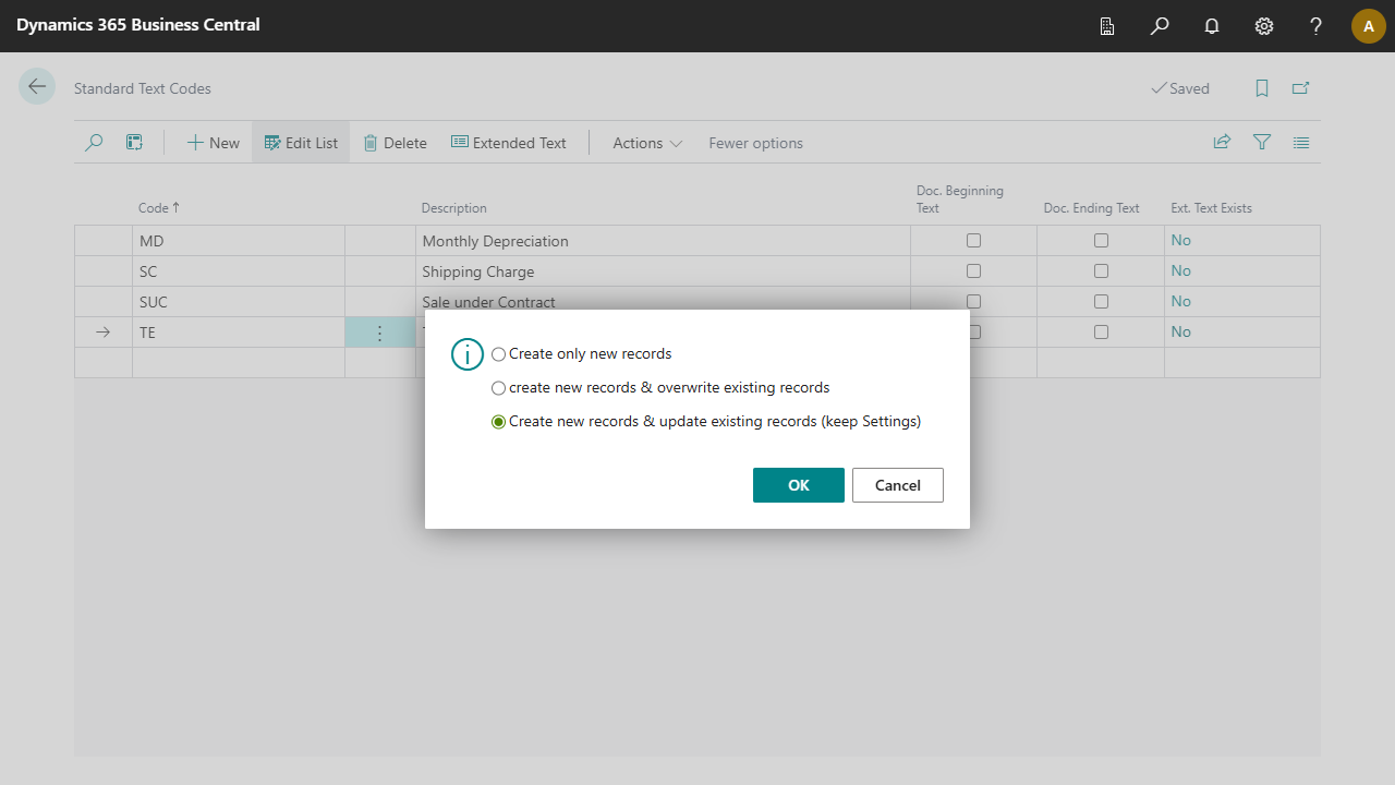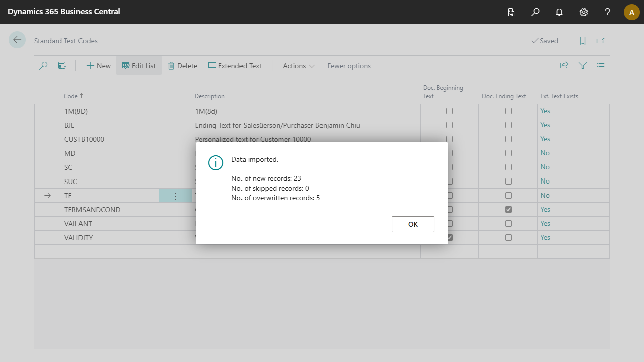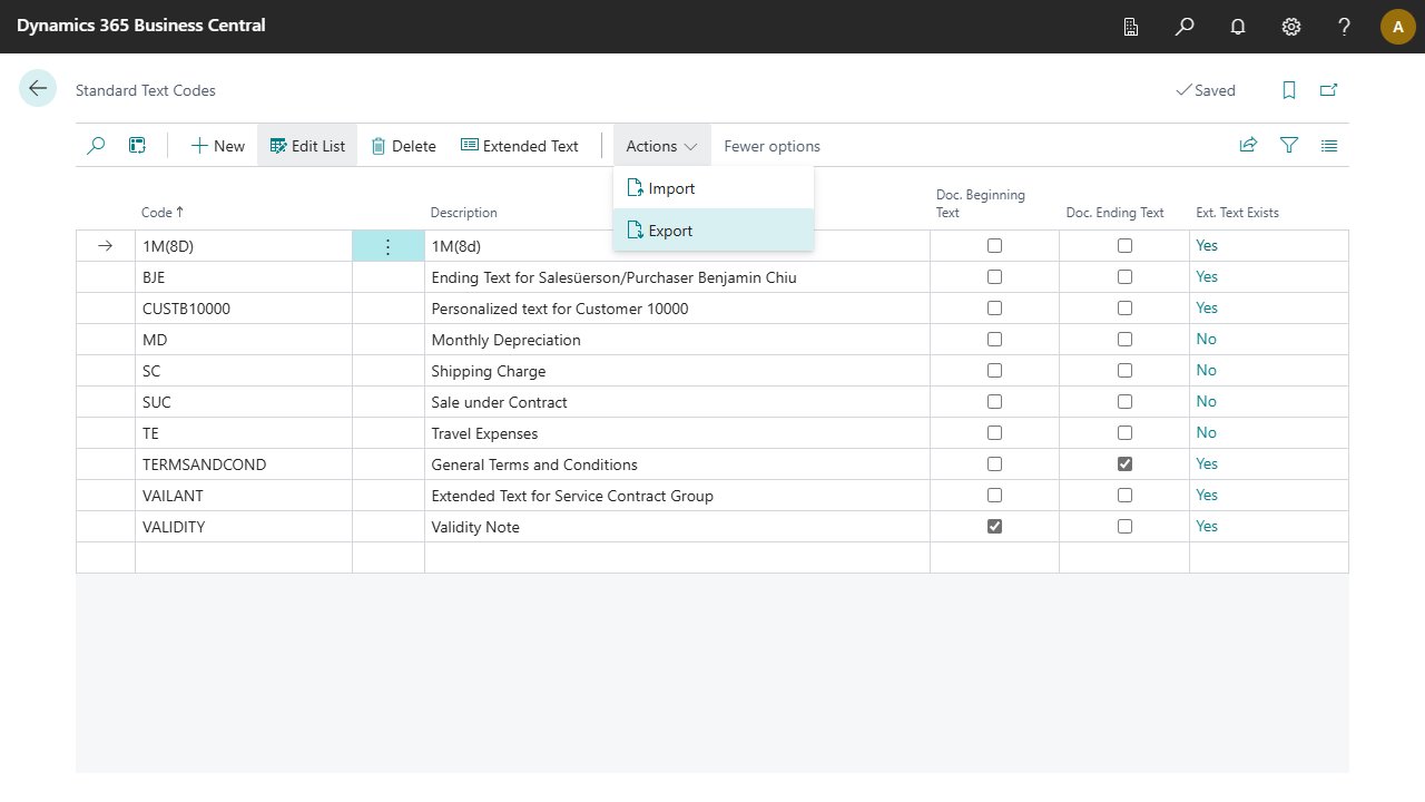 Export/Import With the export and import function, you transfer configured Standard Text Codes between different Business Central installations. This enables efficient management of your extended texts and saves time during setup...