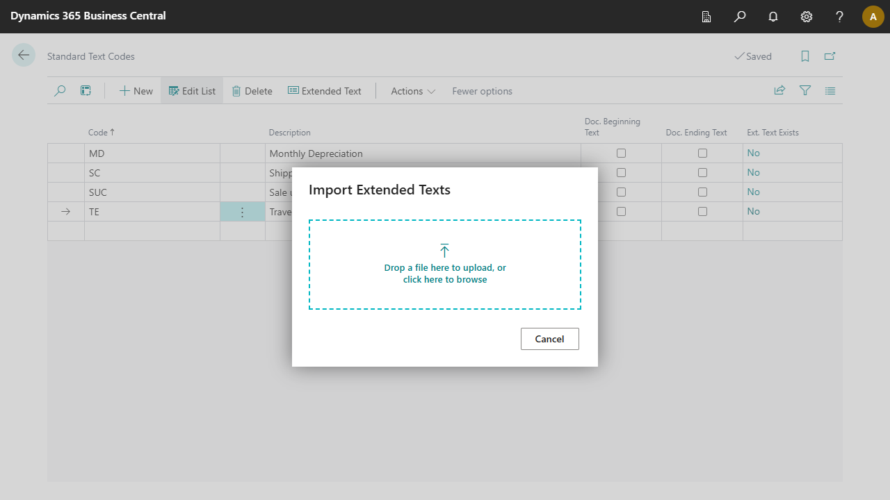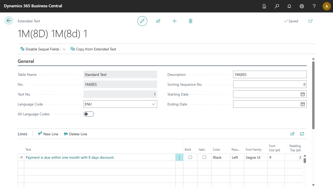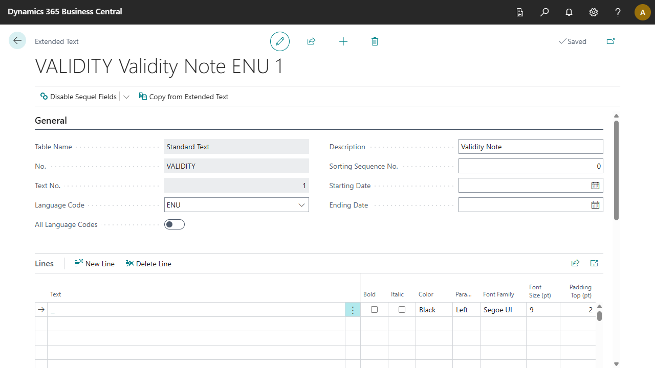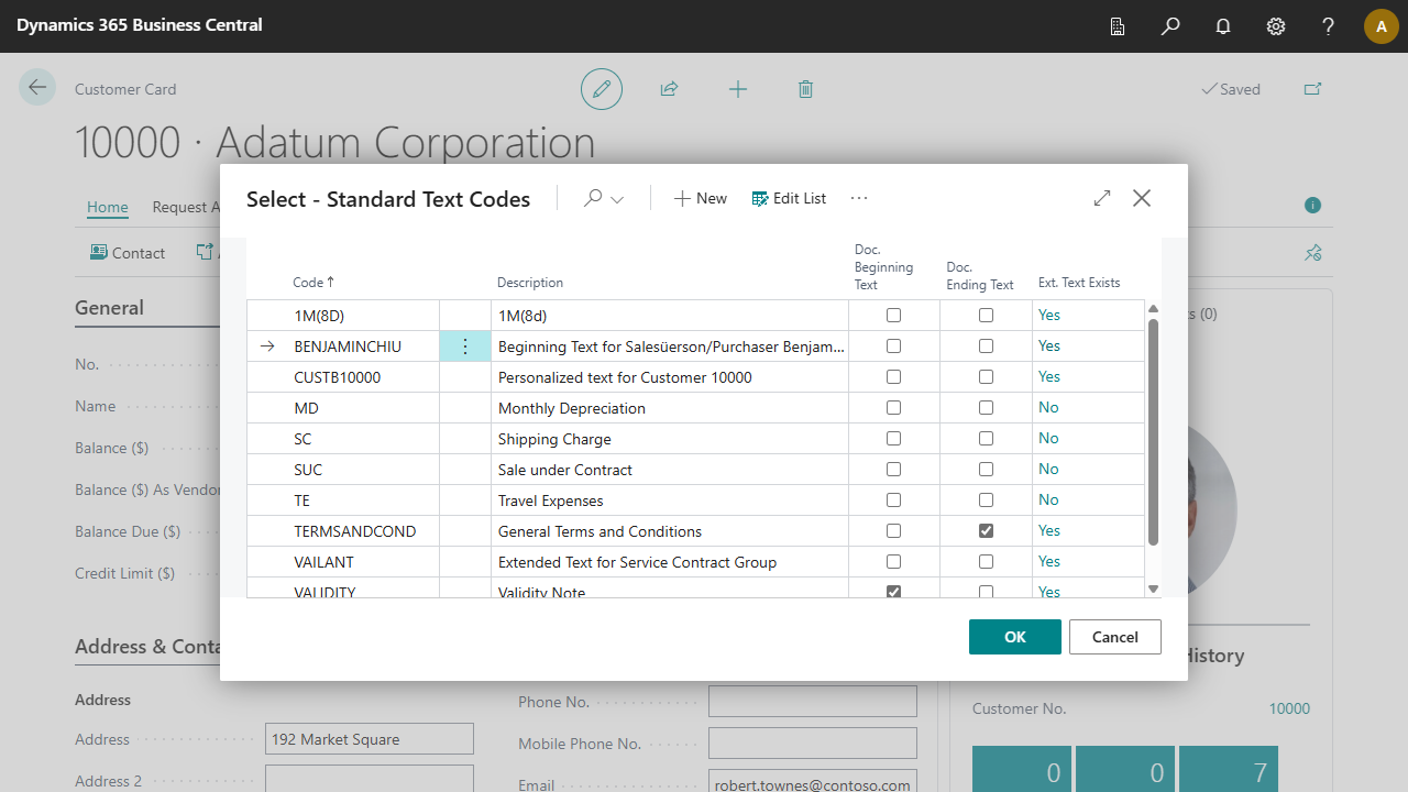Standard Text Code Fields Using Standard Text Codes, you can manage Extended Texts for documents in Dynamics 365 Business Central. These codes allow you to store frequently used texts centrally and insert them on documents as needed...