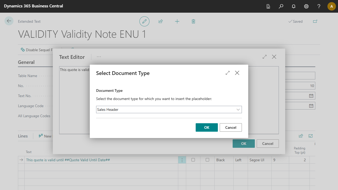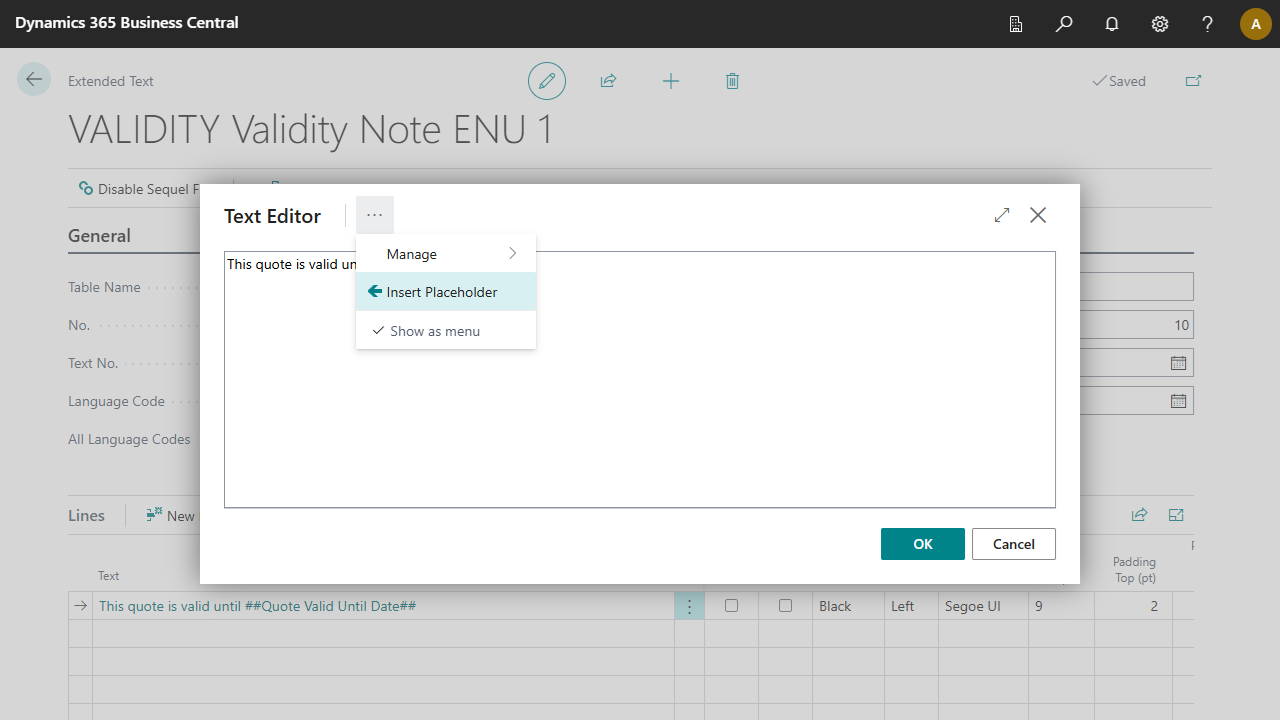 Text Editor and Placeholders NAVAX Document Text provides a text editor that allows you to easily create and edit extended texts for documents. The editor supports placeholders to insert dynamic content from the respective tables. You can copy pre-formatted texts from other programs and paste them into the text editor...