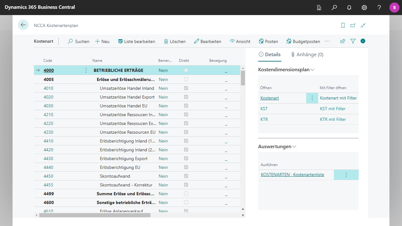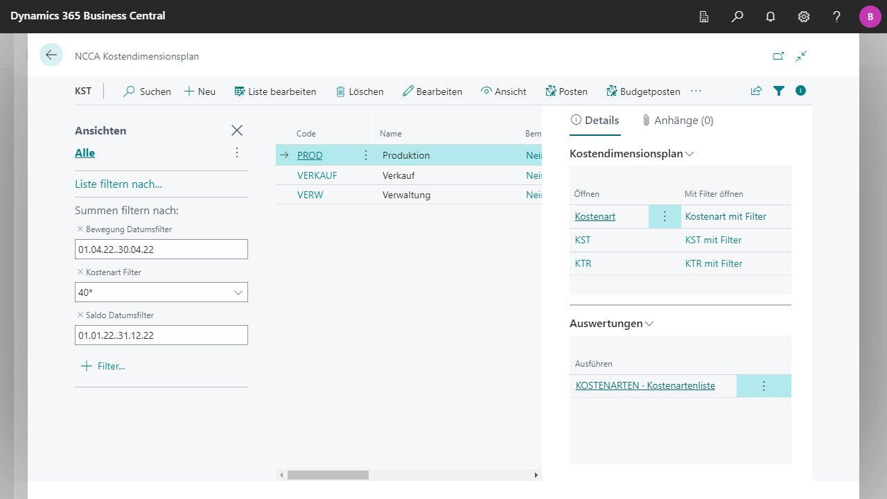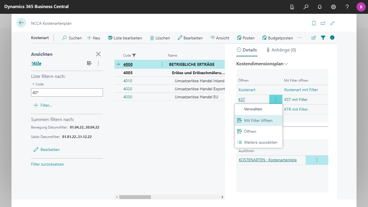 Wir jetzt der Dimensionsplan der Kostenstellen über die Aktion Mit Filter öffnen aufgerufen, werden die im Kostenartenplan gesetzten Filter auch im Dimensionsplan der Kostenstellen gesetzt: