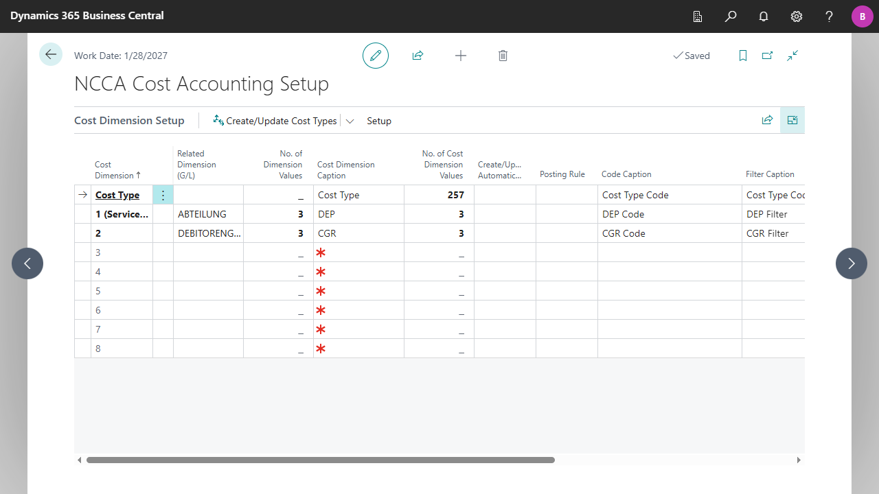 | Cost Dimension Caption | Specifies the caption of the Cost Dimension. The field must be specified so that the cost dimension is active and can be used in NCCA Cost Accounting. |
