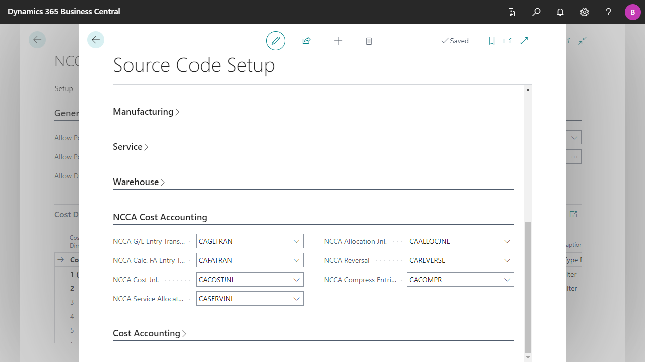 | NCCA Service Allocation Jnl. | Specifies the code assigned to entries that are posted from a service allocation journal. Default value: CASERVJNL |