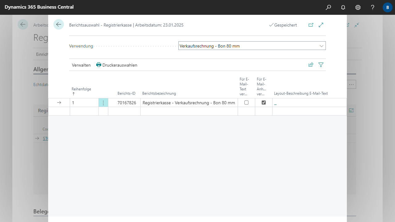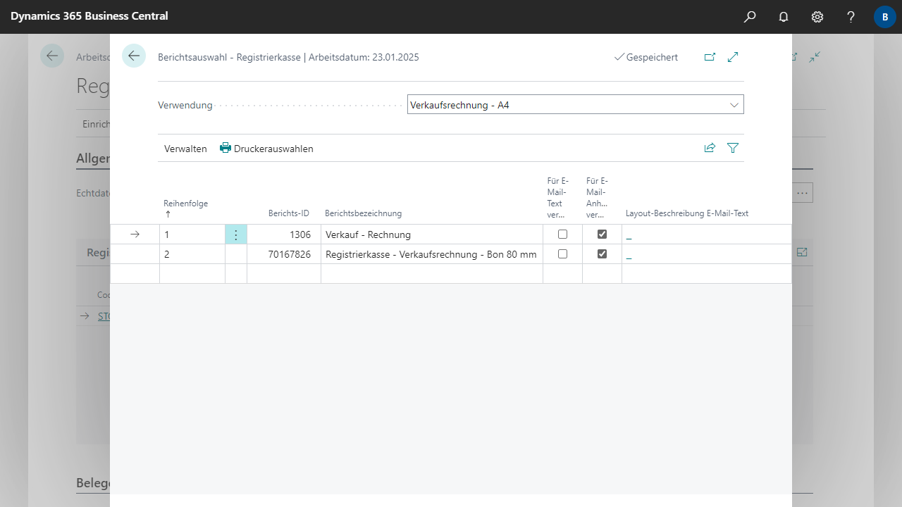 Wenn Sie ein eigenes kundenspezifisches Layout für A4 Belege verwenden, müssen Sie dieses Layout um die Registrierkassendaten erweitern lassen, oder das Registrierkassen-Berichtslayout beim Drucken manuell auswählen.