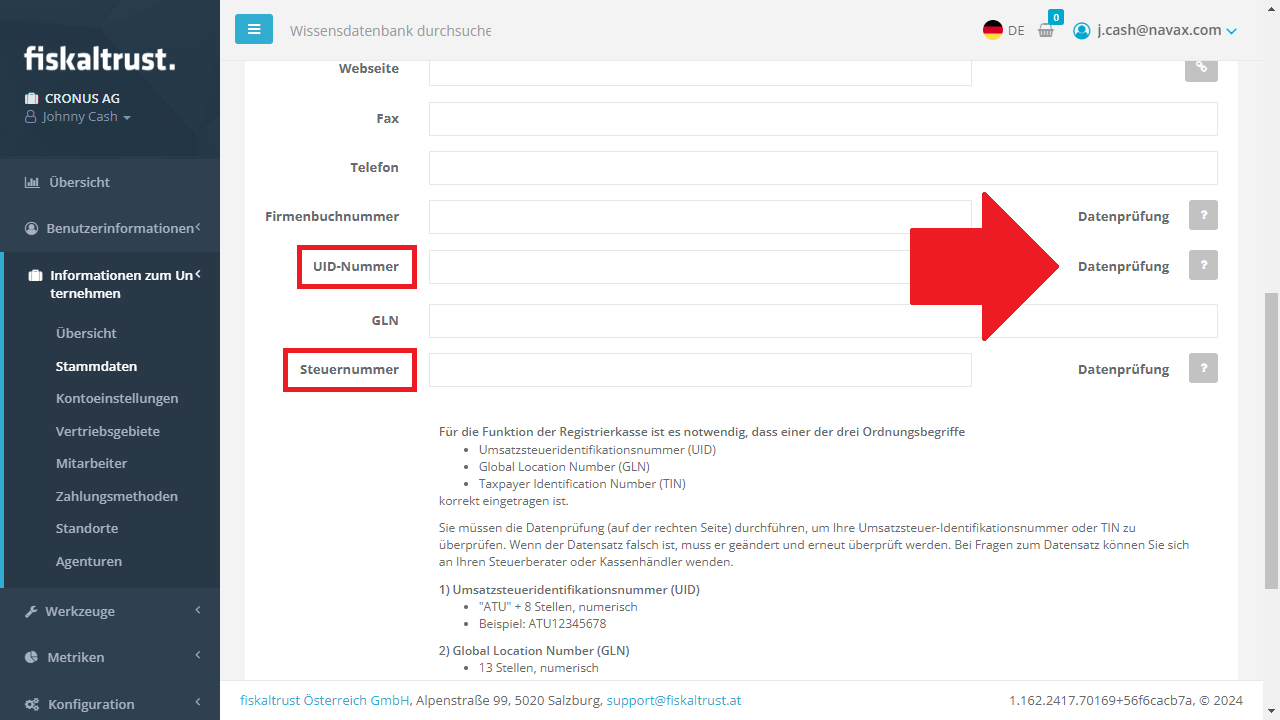 Nachdem Sie die Registrierung abgeschlossen haben, müssen Sie sich am Portal anmelden und Ihre Unternehmensdaten prüfen. Wichtig ist, dass die UID-Nummer oder die Steuernummer angegeben ist und die Datenprüfung durchgeführt wurde. Klicken Sie dazu im Bereich Informationen zum Unternehmen auf Stammdaten: