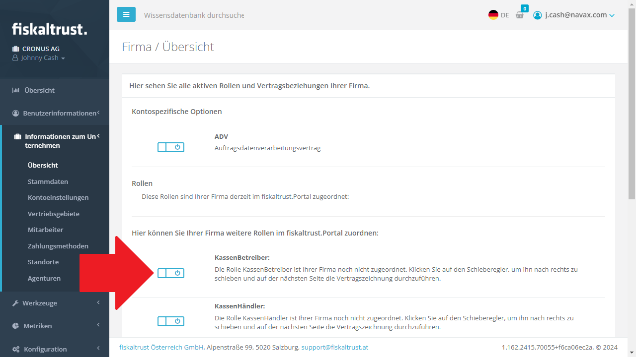 Nachdem Sie die Stammdaten überprüft und die FinanzOnline-Zugangsdaten erfassen haben, müssen Sie Ihr Unternehmen als Kassenbetreiber definieren. Klicken Sie dazu im Bereich Informationen zum Unternehmen auf Übersicht und wählen Sie dort die Rolle KassenBetreiber aus: