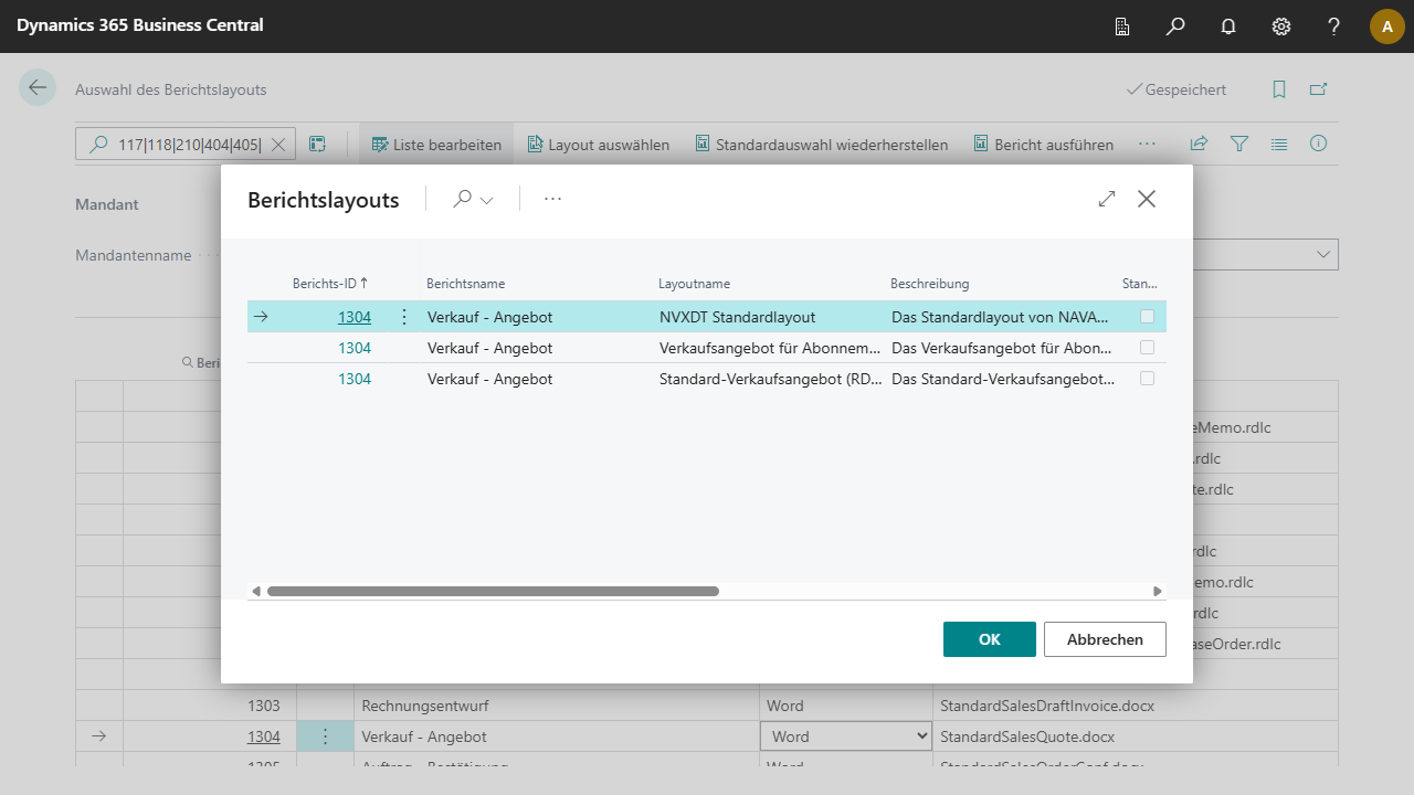 Wählen Sie das gewünschte Layout aus der Liste aus. Das von NAVAX Belegtext bereitgestellte Layout hat den Namen NVXDT Standardlayout und ist in der Spalte Berichtsname zu finden.