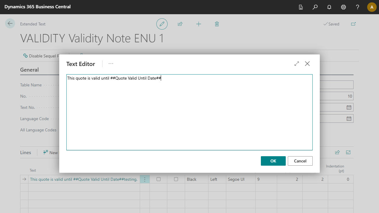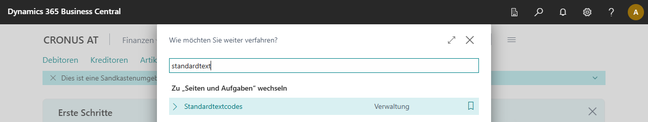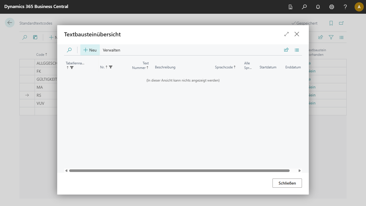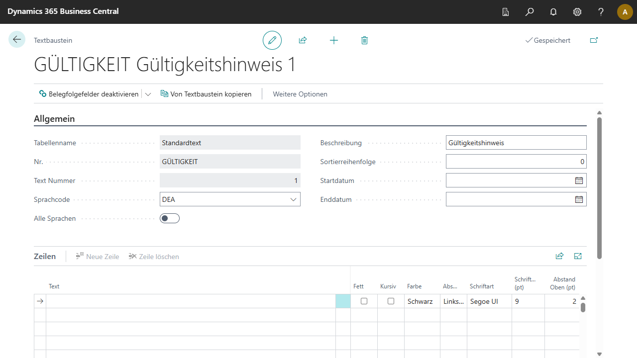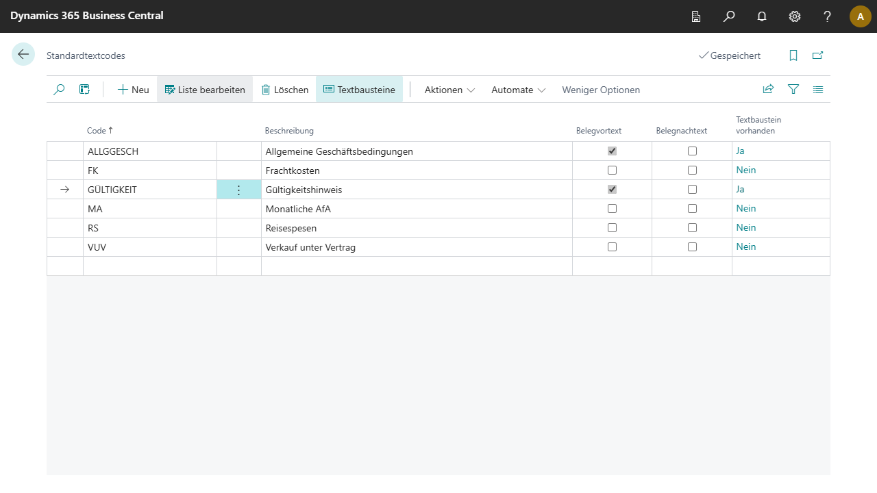 Ein Textbaustein ist ein individuell definierter Text, der entweder automatisch oder manuell in einen Beleg eingefügt wird - abhängig vom gewählten Typ und den definierten Bedingungen. Sie erstellen Textbausteine auf der Seite Standardtextcodes, die Sie über die Suche in Business Central finden.