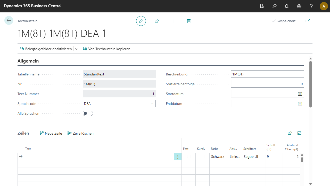 Einrichtung, Textbausteine Ein Textbaustein ist ein individuell definierter Text, der entweder automatisch oder manuell in einen Beleg eingefügt wird - abhängig vom gewählten Typ und den definierten Bedingungen. Sie erstellen Textbausteine auf der Seite Standardtextcodes, die Sie über die Suche in Business Central finden...