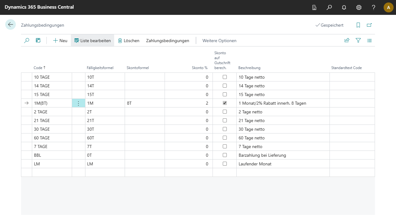 Suchen Sie in der Liste der Zahlungsbedingungen die gewünschte Bedingung und klicken Sie darauf.