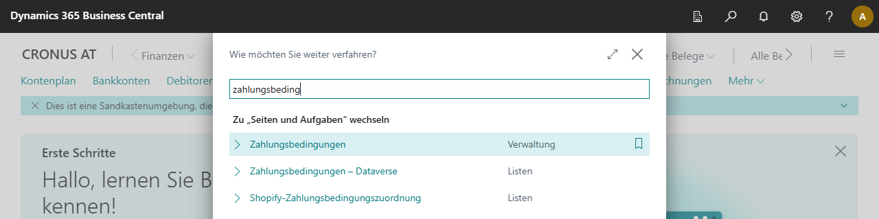 Öffnen Sie die Seite Zahlungsbedingungen über die Suche. Alternativ gelangen Sie über die Belegtexteinrichtung mittels Aktion dorthin.