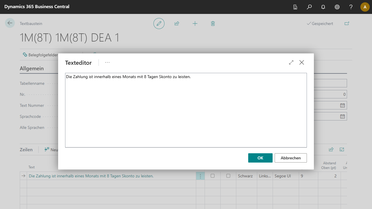Der Wert im Feld Nr. für den Textbaustein wird automatisch aus der Zahlungsbedingung übernommen. So wird der Textbaustein eindeutig zugeordnet.
