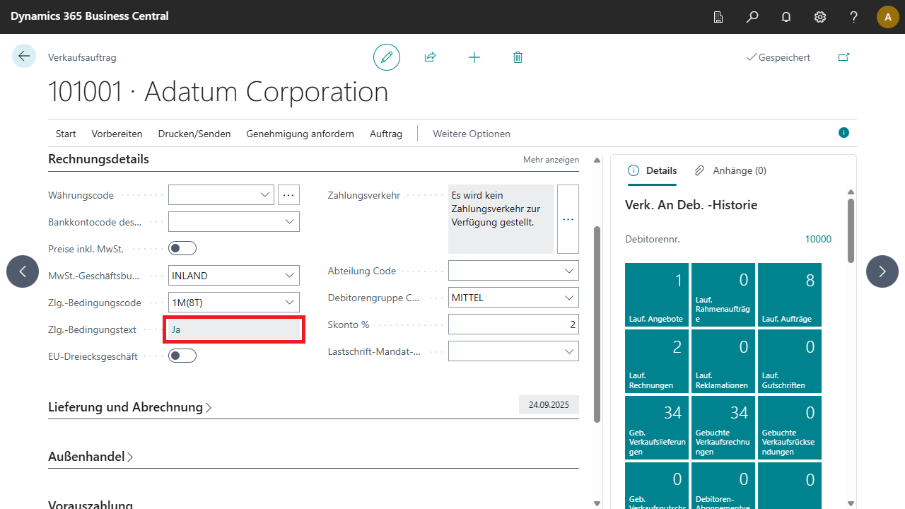 Sobald Sie das Feld Zlg.-Bedingungscode verlassen haben, werden die Zahlungsbedingungstexte eingefügt