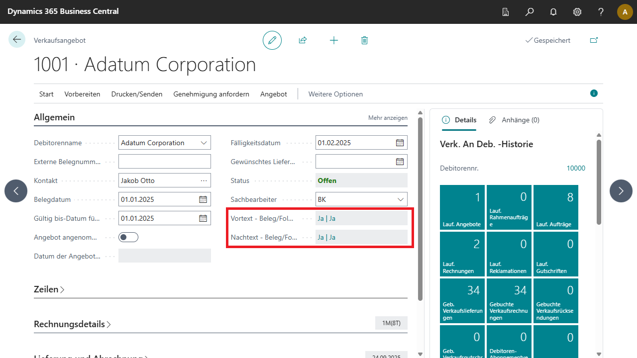 Einrichtung: Auf der Debitorenkarte wurde ein Vortext mit personalisierter Anrede hinterlegt.