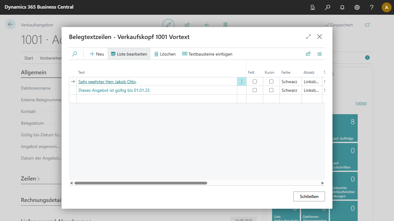 Die personalisierten Texte werden automatisch eingefügt, sobald Sie das Feld verlassen oder den Belegkopf speichern.