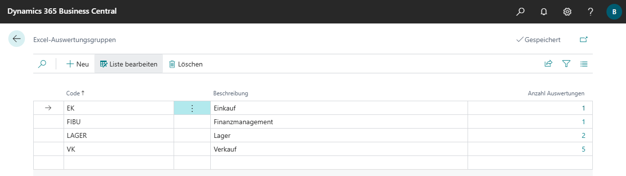 Einrichtung, Auswertungsgruppen Auf der Seite Excel-Auswertungsgruppen können Gruppen für die Auswertungen eingerichtet werden. Die Seite kann in der Excel Report Builder Einrichtung über die entsprechende Aktion in der Gruppe Einrichtung geöffnet werden...