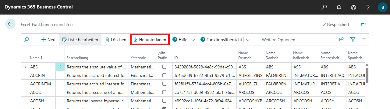 Öffnen Sie als nächstes die Excel-Funktionen über die entsprechende Aktion in der Excel Report Builder Einrichtung. Über die Aktion Herunterladen kann die Einrichtung schnell und einfach durchgeführt werden.