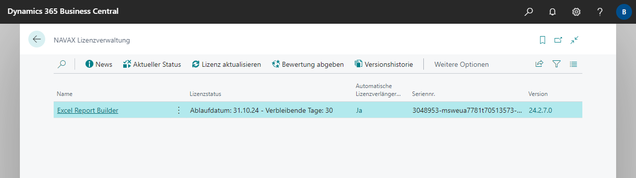 Die Seite NAVAX Lizenzverwaltung zeigt den aktuellen Lizenzstatus der NAVAX-Erweiterungen bzw. des Excel Report Builders an. Eine NAVAX-Erweiterung kann nach der Installation 30 Tage lang kostenlos getestet bzw. genutzt werden. Danach kann die Erweiterung nur mehr mit einer gültigen Lizenz verwendet werden.