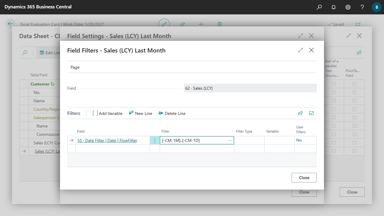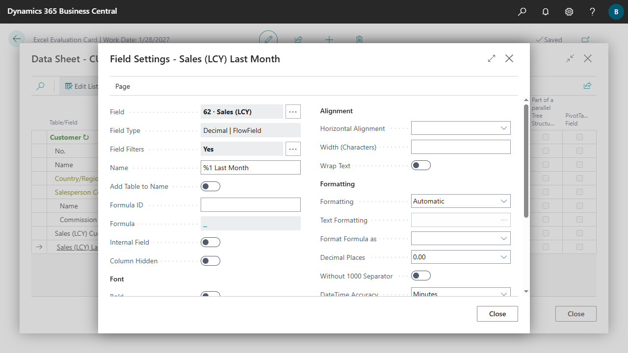 Depending on the type of field, different formatting options are available. A lookup can be used to select from all the options that Business Central provides for the field. The formatting parameters can still be changed manually afterwards.