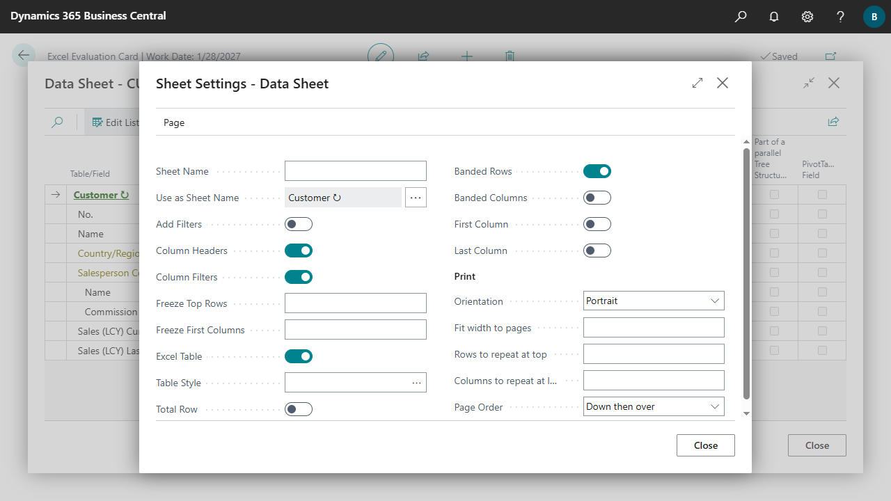 | Total Row | Specifies whether to turn on or off the total row of the Excel Table. The Total Row Type can be set for each field individually via the Field Settings of the Data Sheet line(s). |