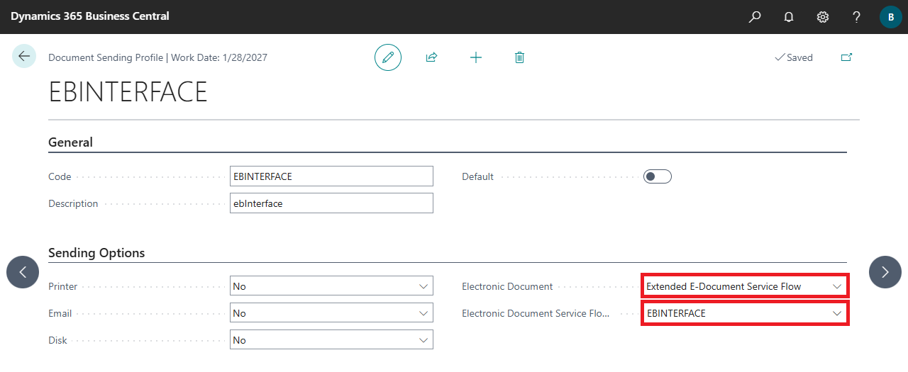 | Electronic Document Service Flow Code | Select the previously configured workflow here. For more information, see Setup, E-Documents, Workflows. |