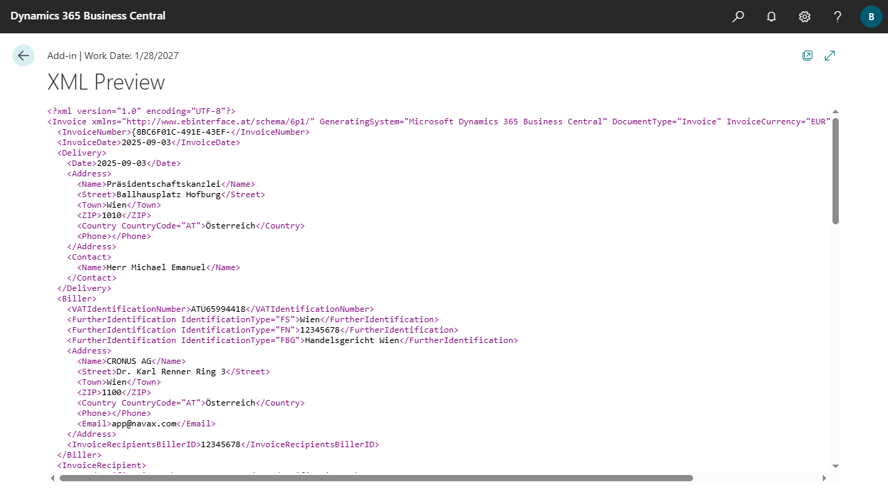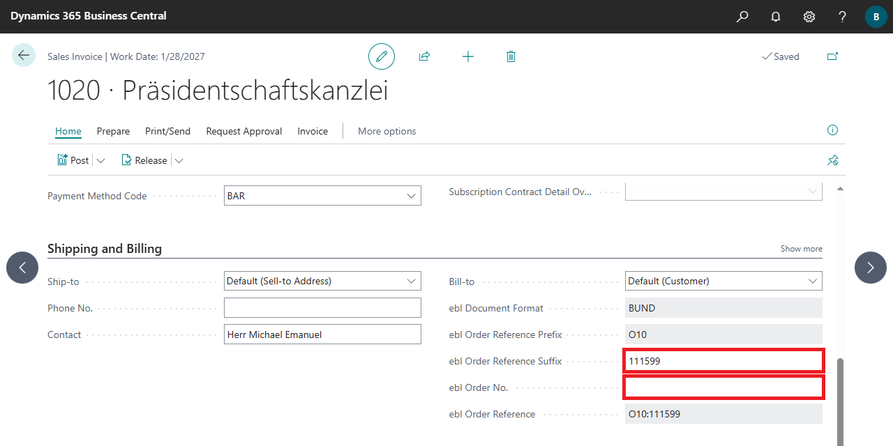 | ebI Order Reference | Displays the order reference for ebInterface. The reference is either an order number or a combination of prefix and suffix. The order reference is the reference assigned by the invoice recipient (or possibly by the purchaser) from the associated order. The reference is used to route the invoice to the invoice recipient. |