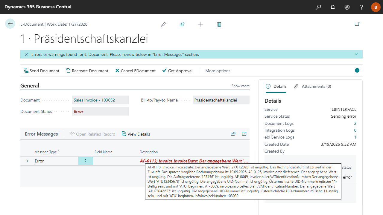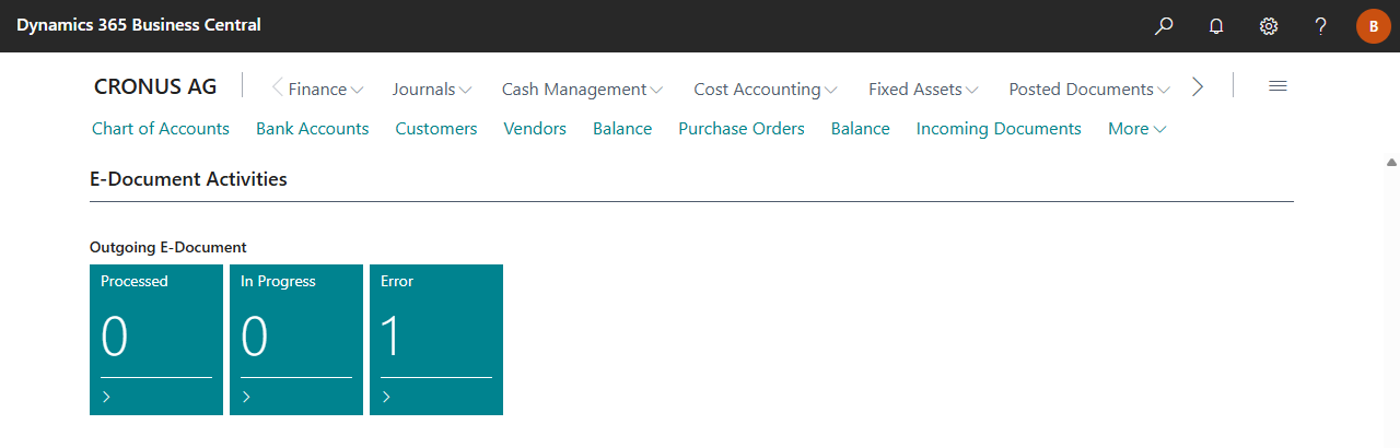 To get an overview of all e-documents in the company, the following cues (status tiles) are available in the Accountant role: Click on the cues to open the E-Documents and check the status manually.