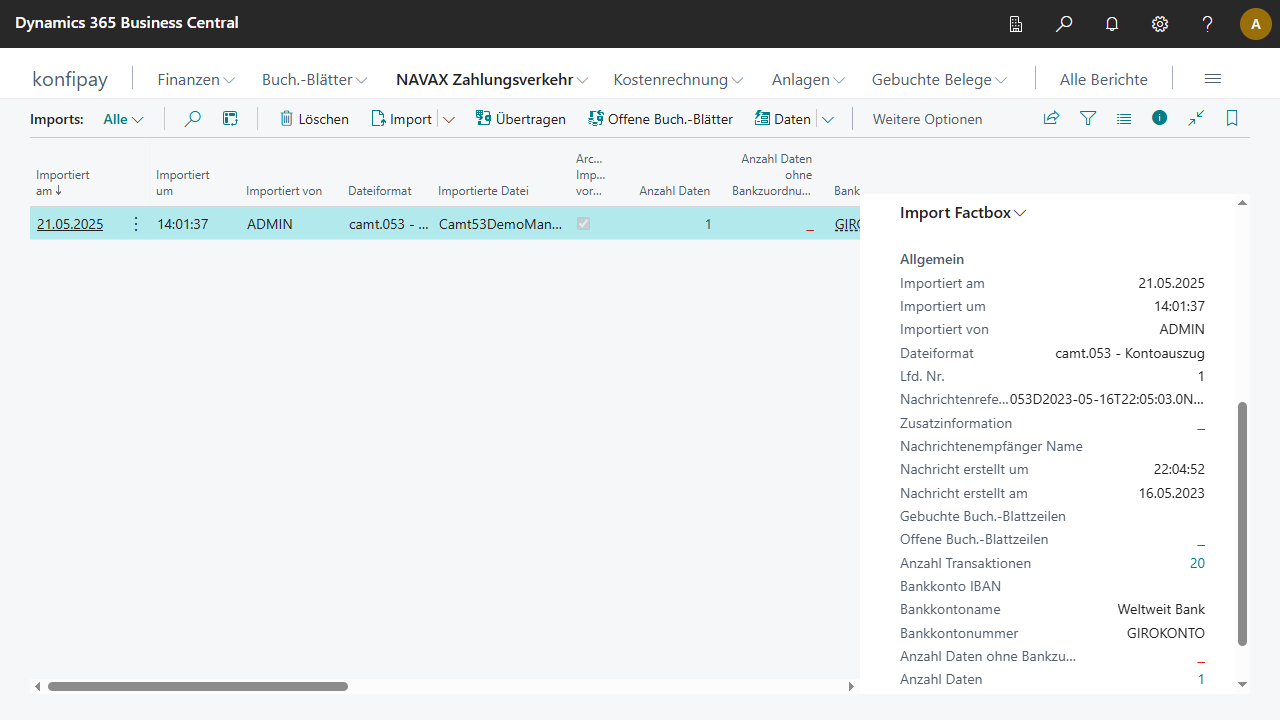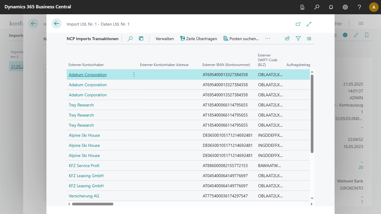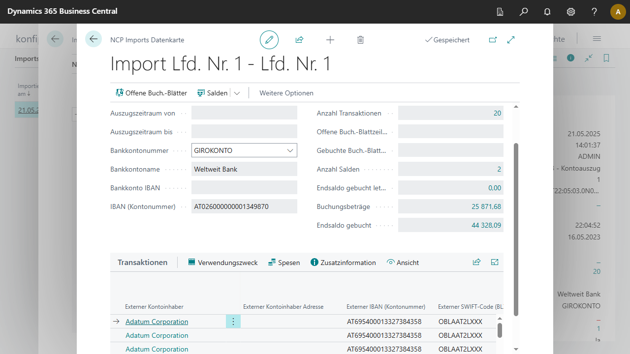 | Bankkonto IBAN | Wenn die NCP Imports Daten alle das selbe Bankkonto hinterlegt haben, wird der IBAN hier angezeigt. Bei unterschiedlichen Konten wird kein Wert angezeigt. |