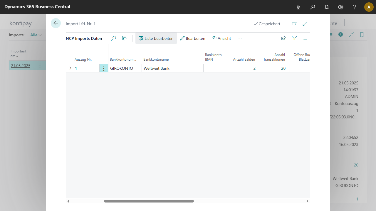 | Bankkontoname | Wenn die NCP Imports Daten alle das selbe Bankkonto hinterlegt haben, wird der Bankkontoname hier angezeigt. Bei unterschiedlichen Konten wird kein Wert angezeigt. |