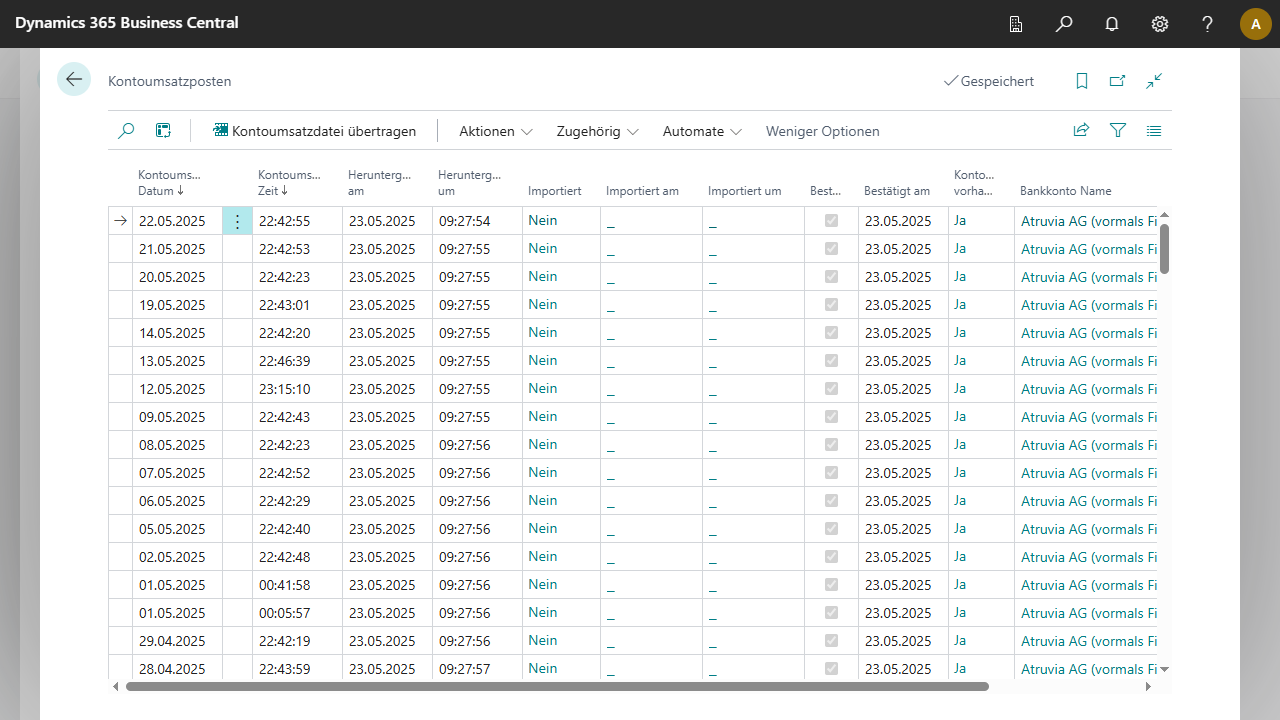 | Heruntergeladen um | Zeigt die Zeit an wann der Kontoumsatz in Business Central heruntergeladen wurde. |