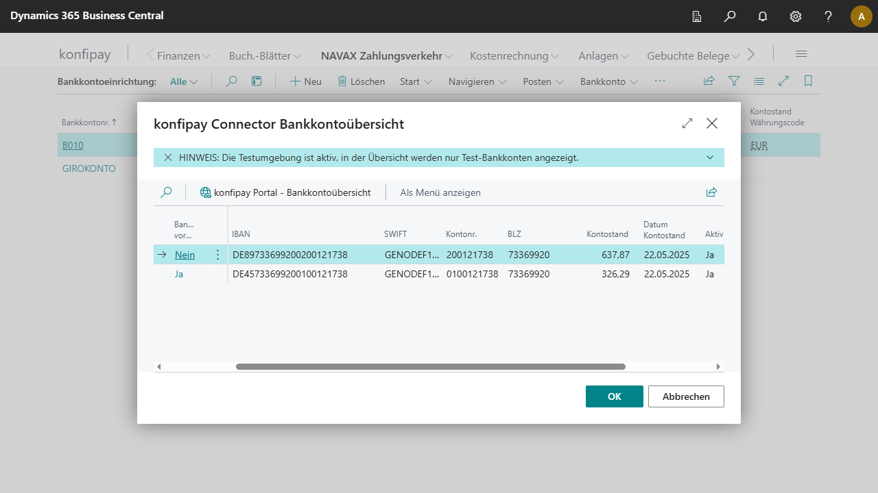 | Bankkonto vorhanden | Zeigt an, ob ein Bankkonto mit den gleichen Daten bereits in Business Central vorhanden ist. Wenn Sie einen (oder mehrere) Datensatz(e) auswählen und mit OK bestätigen, wird ein vorhandenes Bankkonto mit den Daten des ausgewählten Eintrags aktualisiert. Wenn das Bankkonto noch nicht vorhanden ist, wird es neu erstellt. Ist ein Bankkonto vorhanden das bereits von konfipay importiert wurde, aber z.B. versehentlich gelöscht, wird nach erneuten importieren des selben Kontos die Zuordnung wiederhergestellt. |