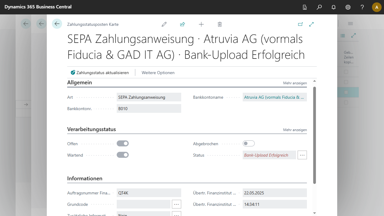 | Zusätzliche Informationen | Zeigt zusätzliche Informationen über den Status der Datei innerhalb des Finanzinstituts als freien Text an. Das Feld für zusätzliche Informationen bietet Details zum Status der Zahlungsdatei innerhalb der Finanzinstitution. Es kann Erklärungen, Notizen oder andere relevante Informationen enthalten, die den Grundcode ergänzen und bei der Recherche helfen. |