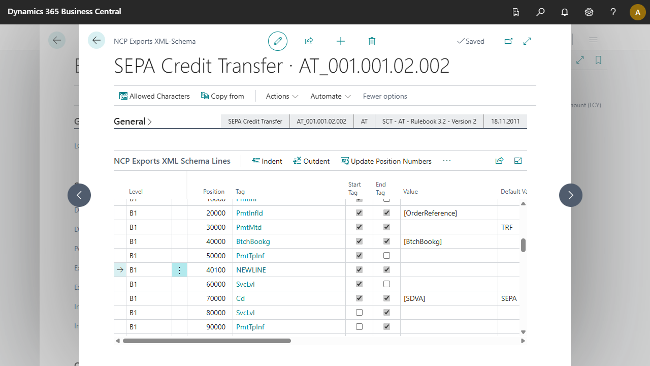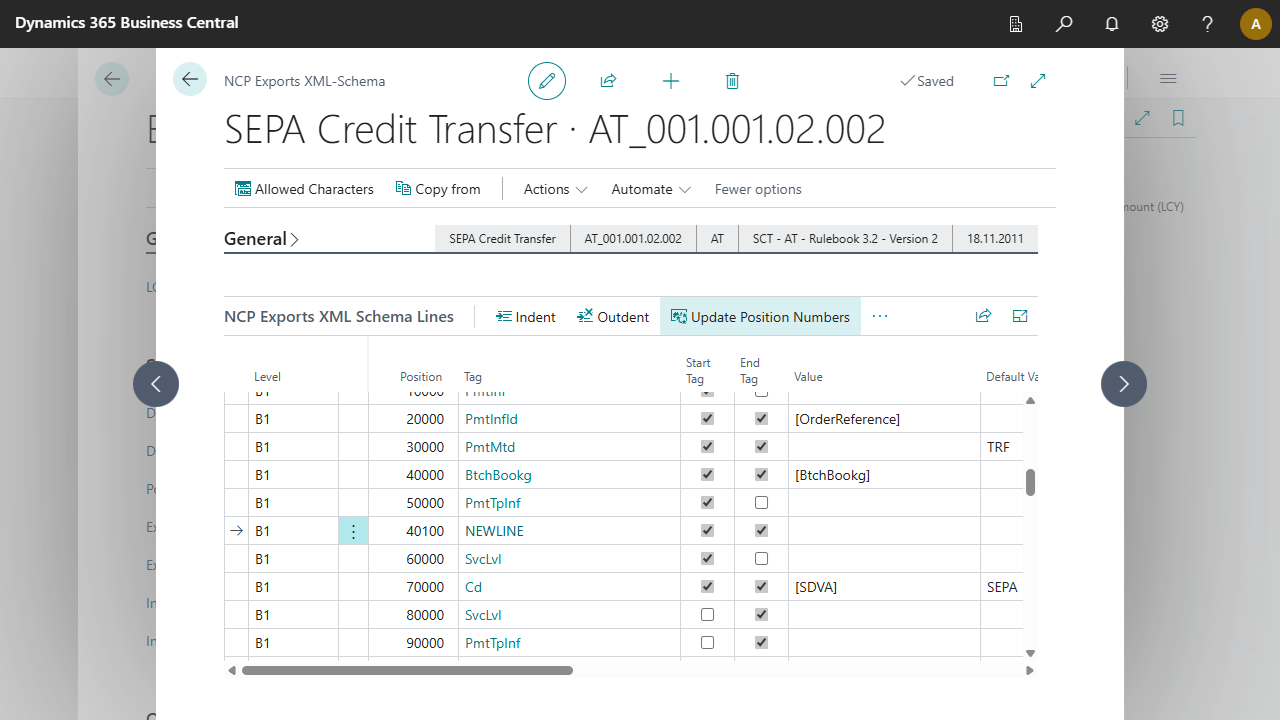 | Level | Specifies the level. The level can be understood as the parent XML nodes (e.g., GrpHdr, PmtInf..), within the level the position numbers are assigned per child XML node.