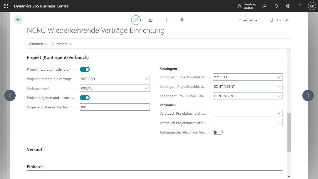 Definieren Sie außerdem die Projekt Buch.-Blattvorlage, den Projekt Buch.-Blattnamen sowie die Projekt Buch.-Blatt Belegnummernserie die für die Verbuchung von Kontingenten verwendet werden soll.