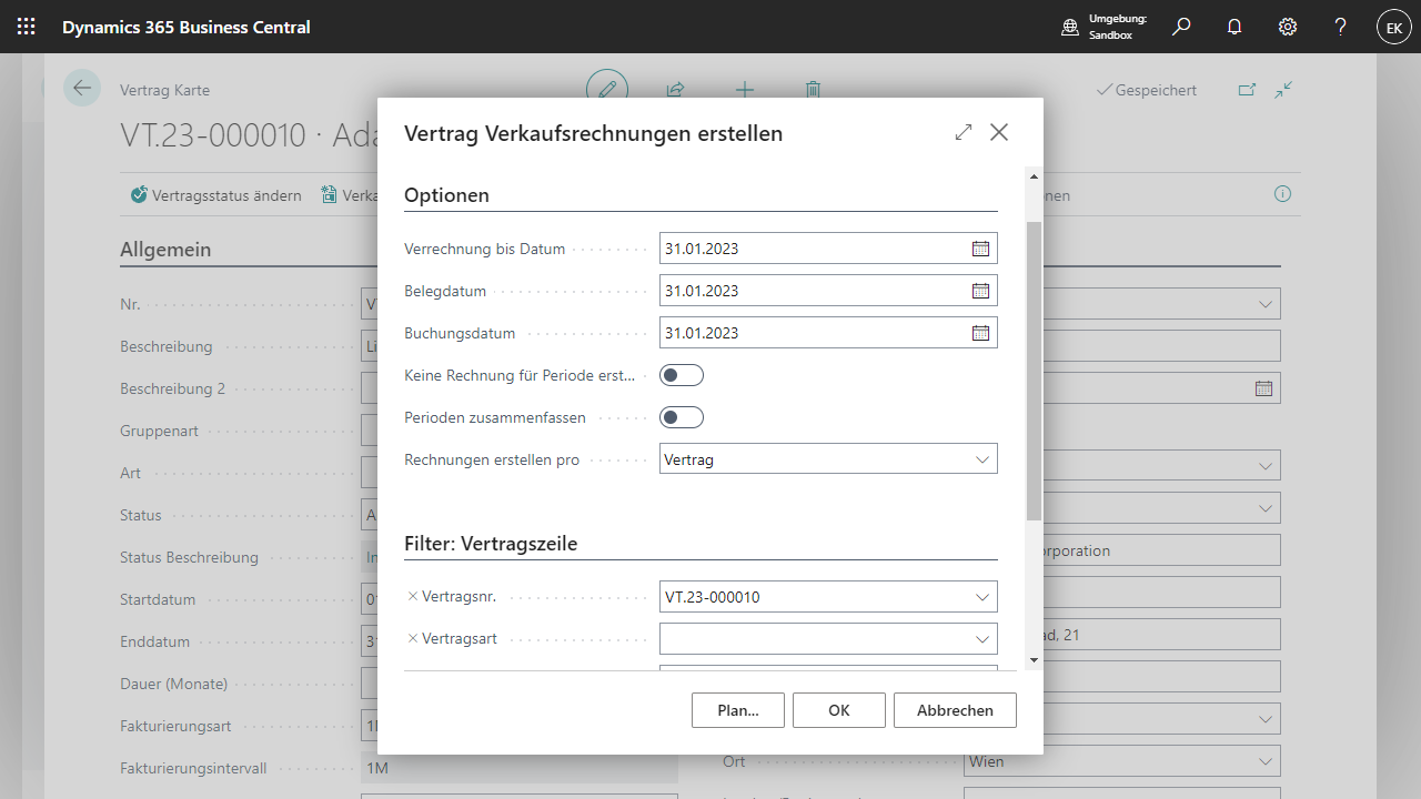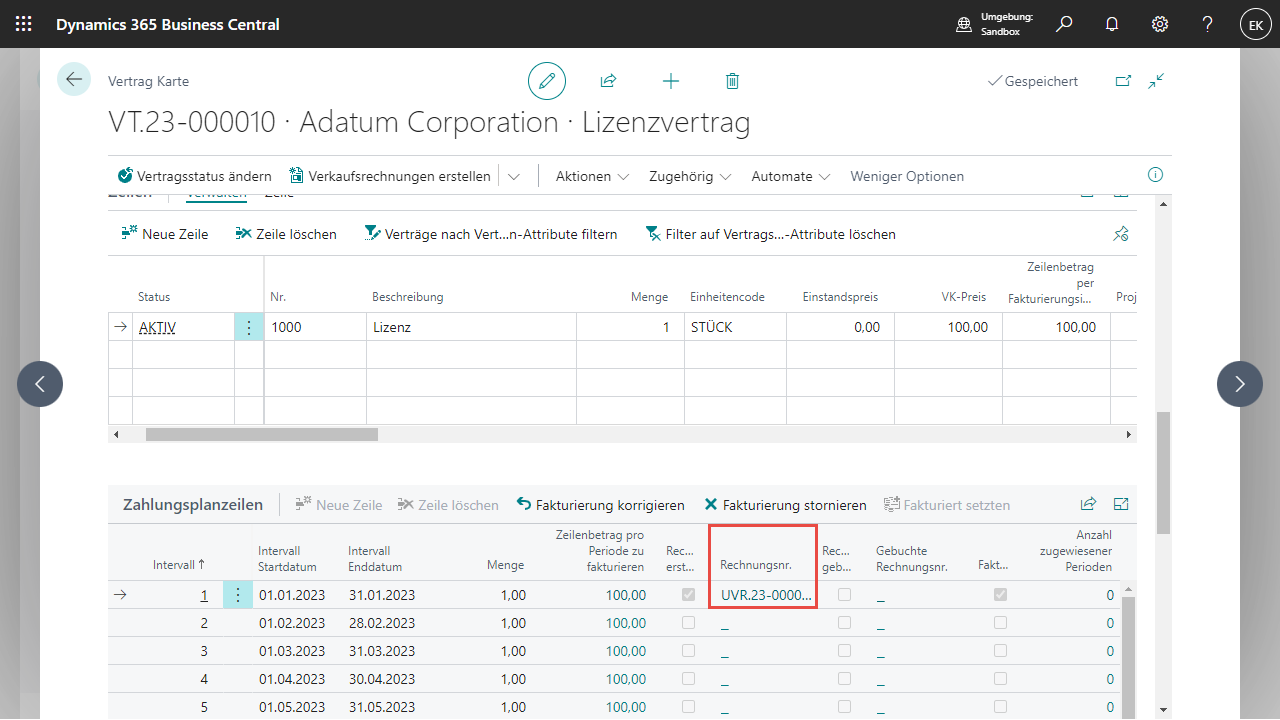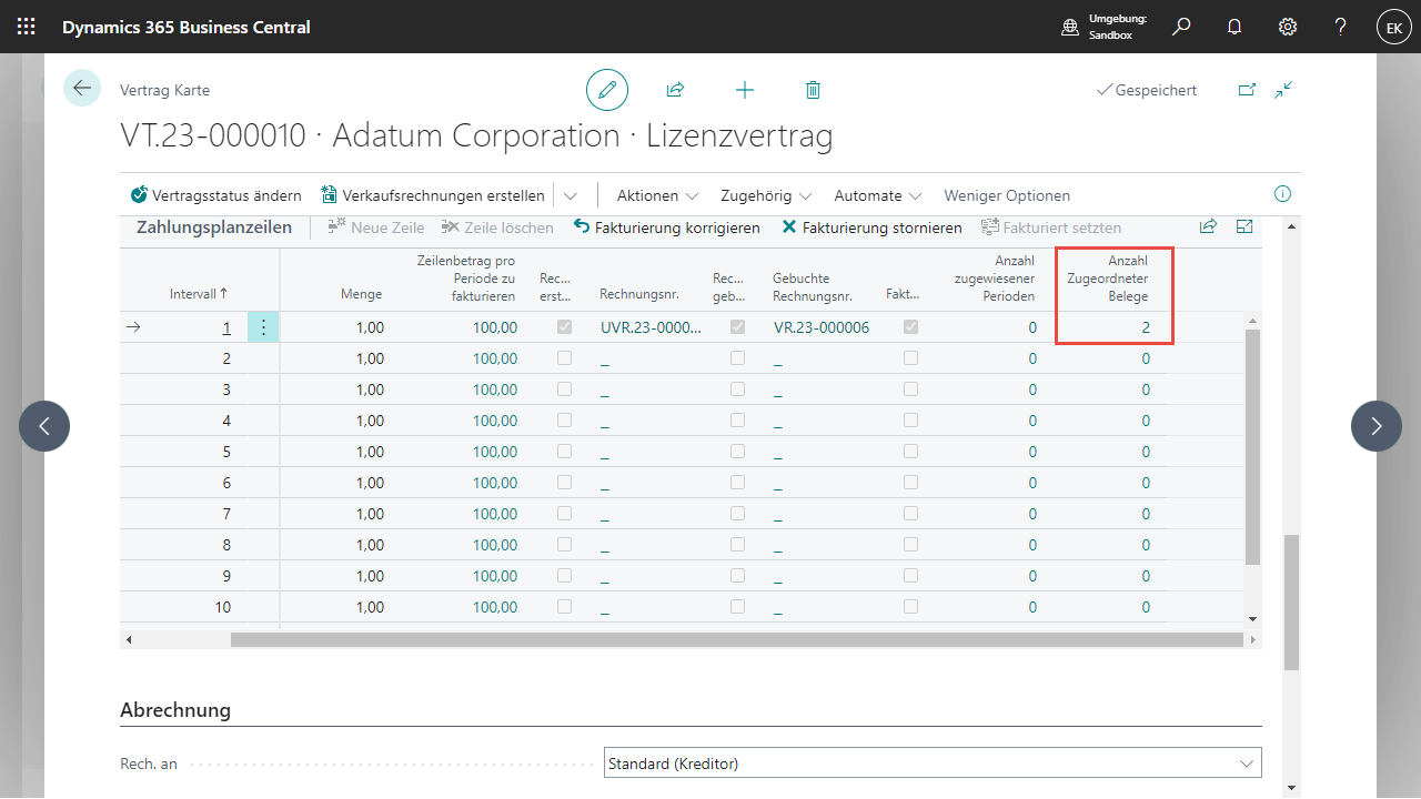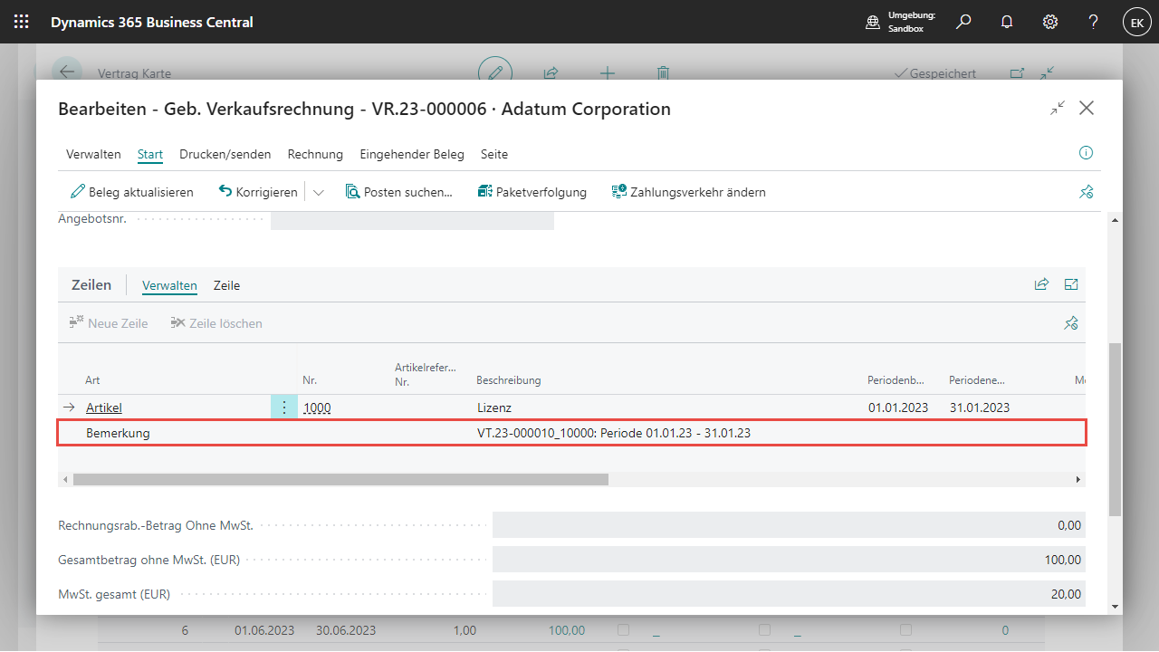 Für jeder Verkaufsrechnungszeile, welche aus einem Vertrag heraus erstellt wird, wird eine Bemerkungszeile angelegt welche Rückschlüsse auf die Vertragsnummer und Vertragszeilennr. Sowie die Periode gibt.