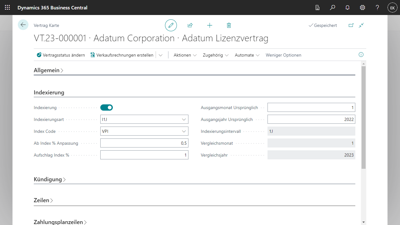 Nachdem die Indexierung erfolgreich durchgeführt wurde, werden die neuen Index-Werte (Monat/Jahr) im der Vertragszeile angepasst. Am Vertragskopf bleiben die ursprünglichen Werte bestehen.