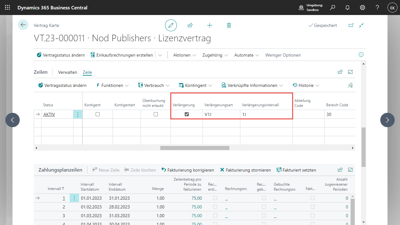 Dieses Intervall wird dann zur Kalkulation des neuen Enddatums der Vertragszeile verwendet.