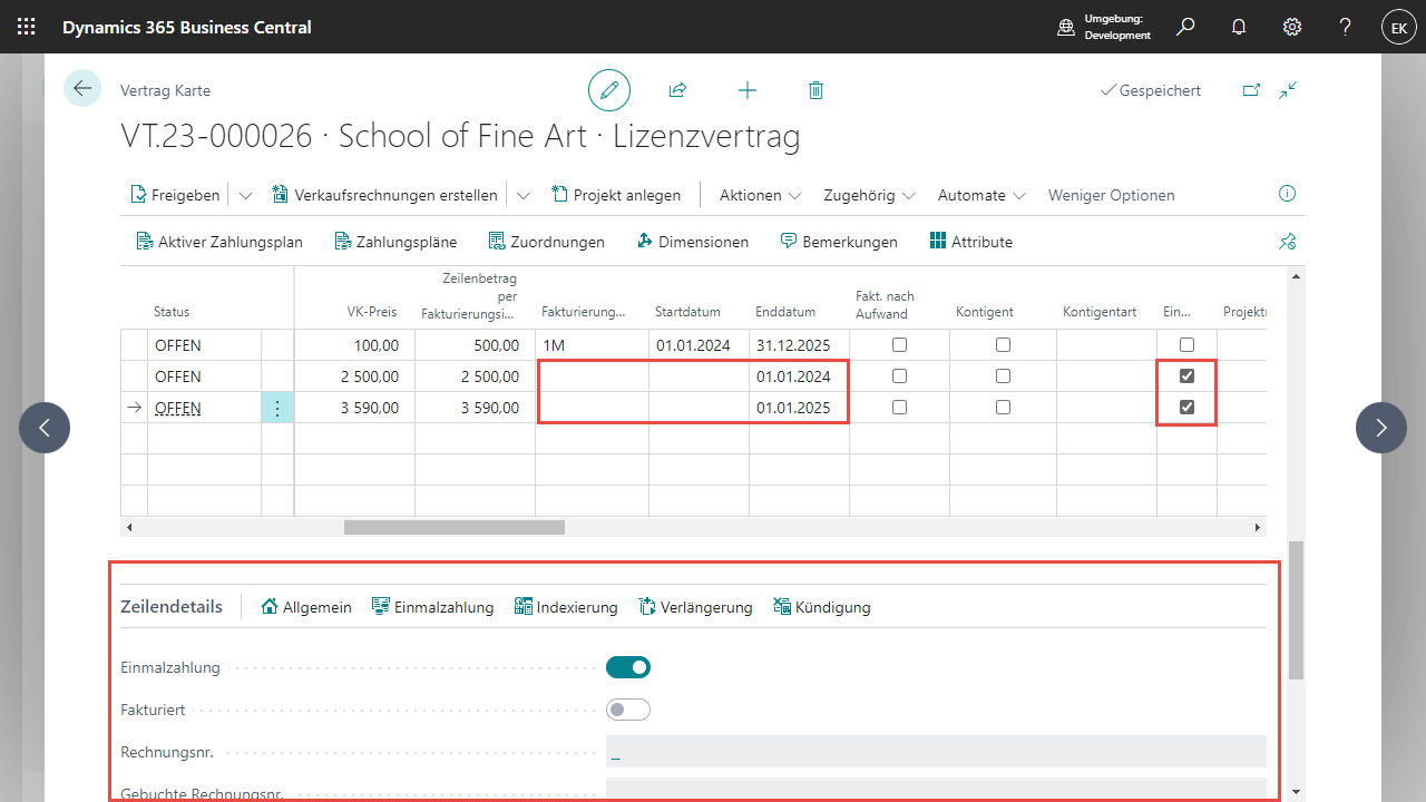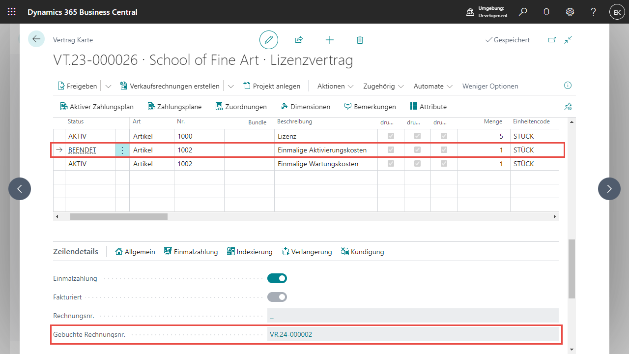Im Gegensatz zu wiederkehrend verrechneten Vertragszeilen, besitzen Einmalige Vertragszeilen keinen Zahlungsplan. Erstellte Verkaufsrechnungen werden in den Zeilendetails im Feld Rechnungsnr. Bzw. Gebuchte Rechnungsnr. Angezeigt.
