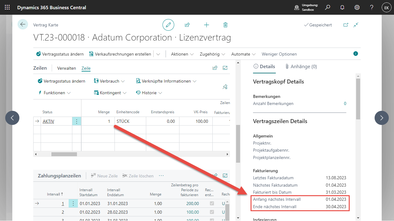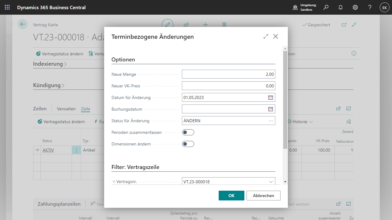 Erst wenn die neue Menge das nächste Fakturierungsintervall betrifft, wird die neue Menge automatisch in die Vertragszeile übernommen.