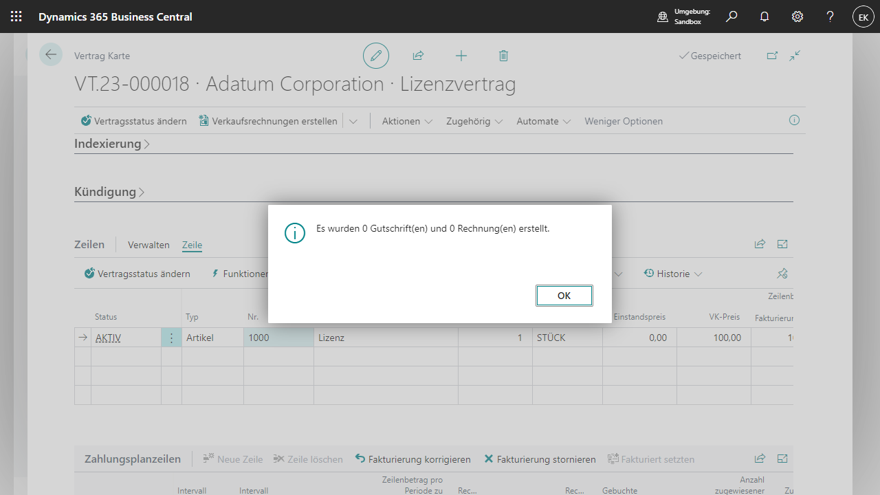 Die Menge in der Vertragszeile wurde nicht erhöht, da die neue Menge das nächste Fakturierungsintervall noch nicht betrifft.