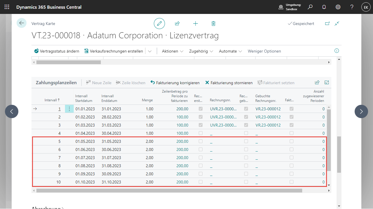 Die Menge wurde aber der Periode 5 von 1 auf 2 erhöht, was zu einer Erhöhung des Zeilenbetrags aber keinem zusätzlichen Beleg führt.