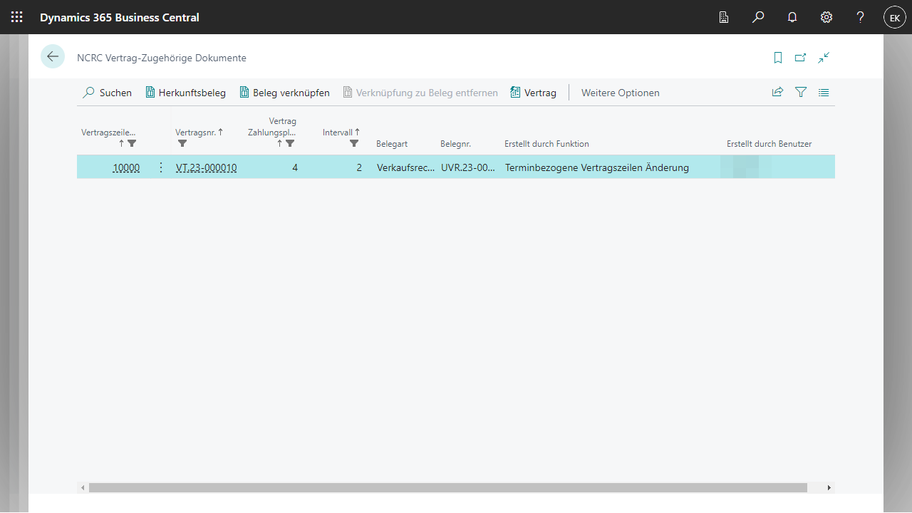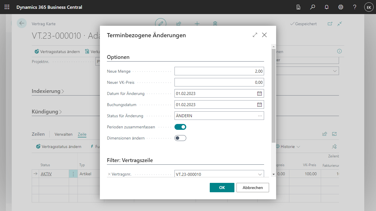 Die Menge in der Vertragszeile wurde auch erhöht, da die neue Menge das nächste Fakturierungsintervall betrifft.