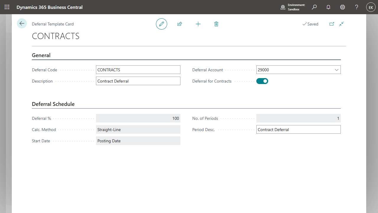 Automatisierte AbgrenzungRevenues relating to future periods can be accrued automatically. To do this, create a deferral template and activate Deferral for Contracts. As a result, the following fields can no longer be edited: