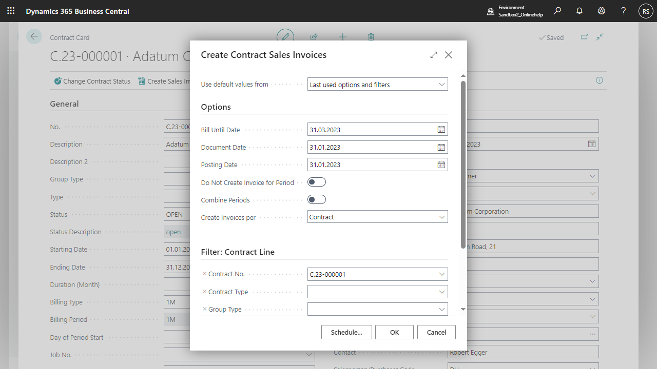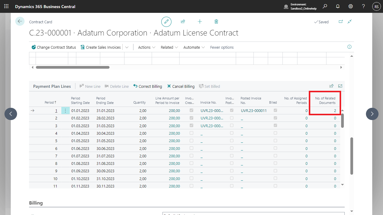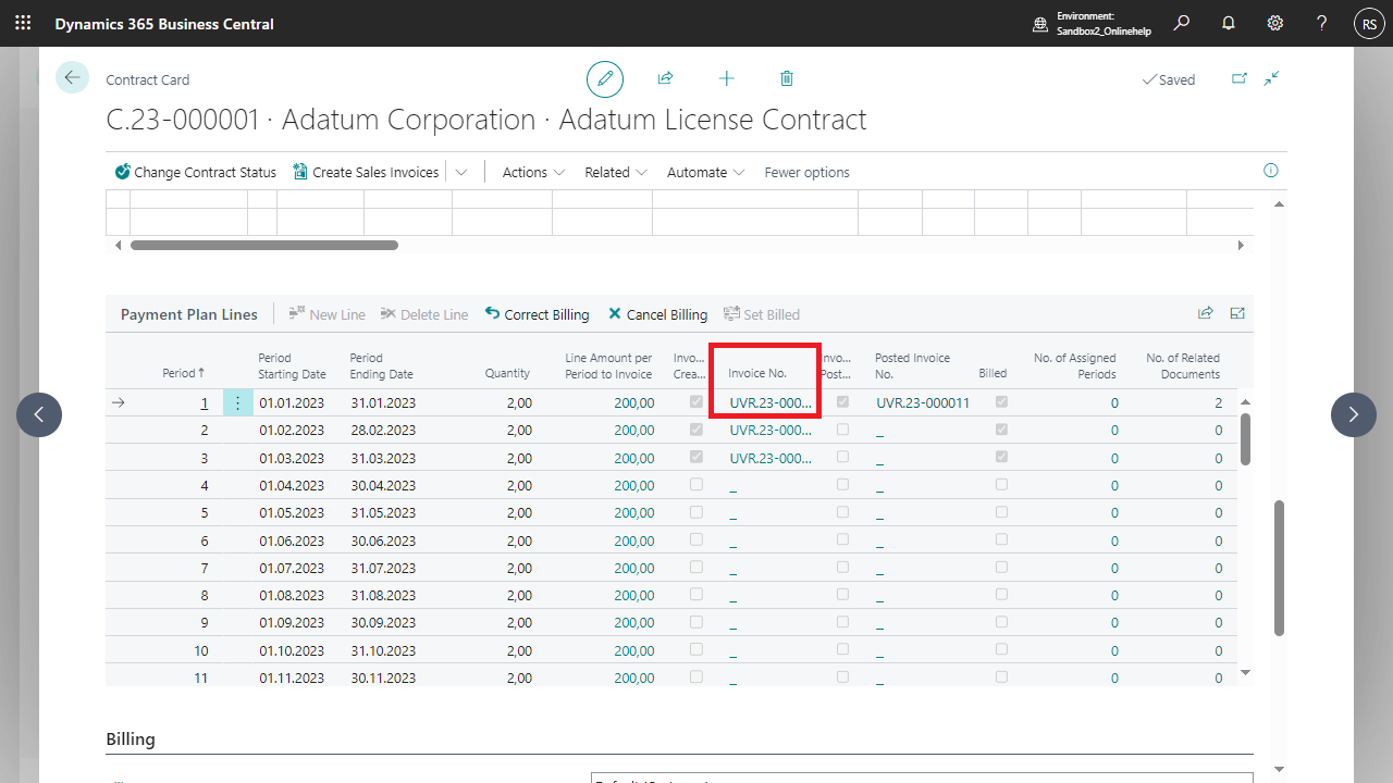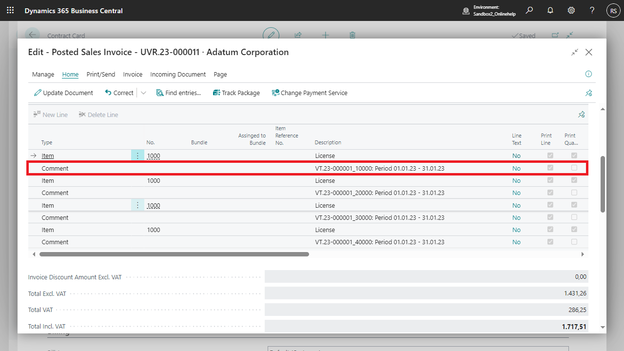 For each sales invoice line, which is created from a Contract, a remark line is created which gives conclusions about the Contract number and Contract line number, as well as the period.