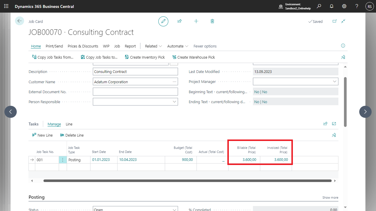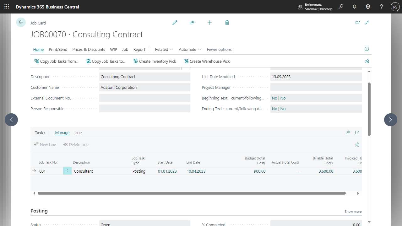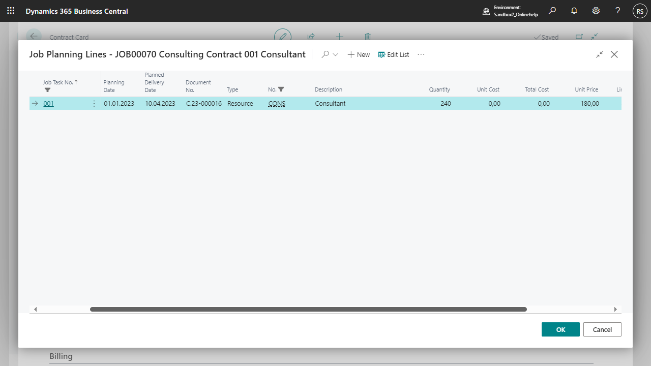A Job is created for each Contract line. The Job Task No. is assigned based on the Start No. in the NCRC Recurring Contracts Setup. The description corresponds to the description of the Contract line.
