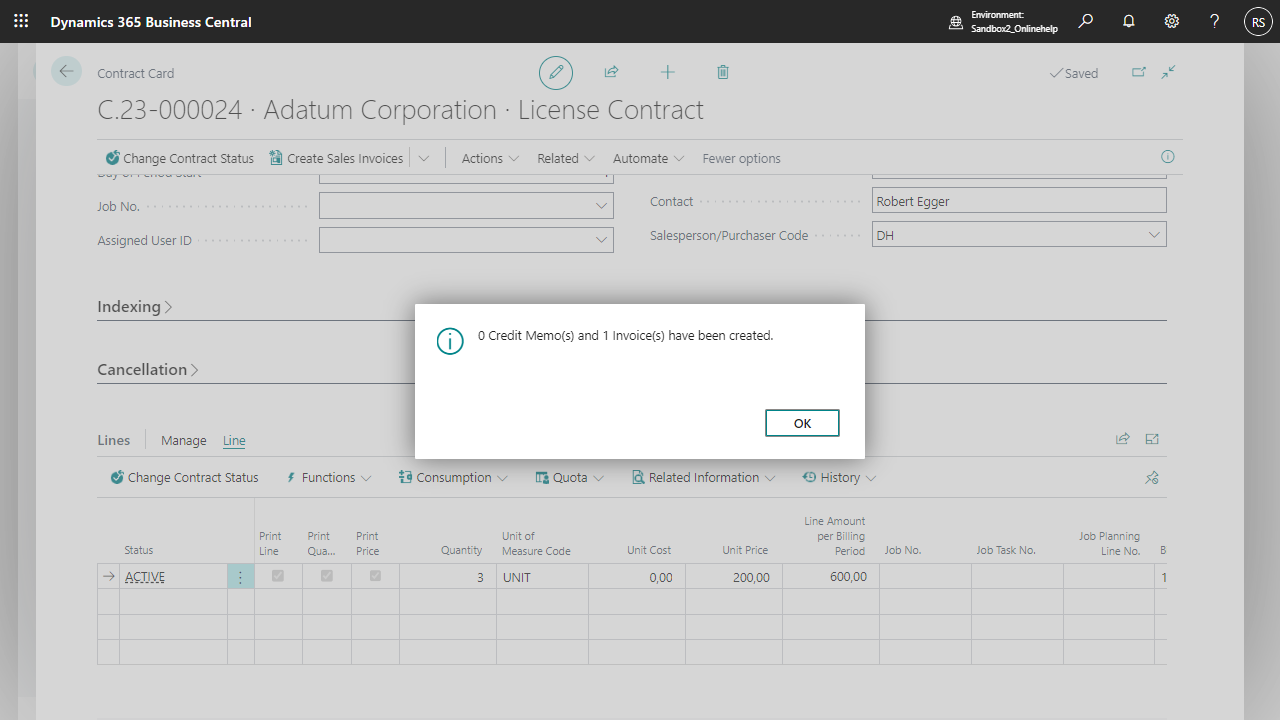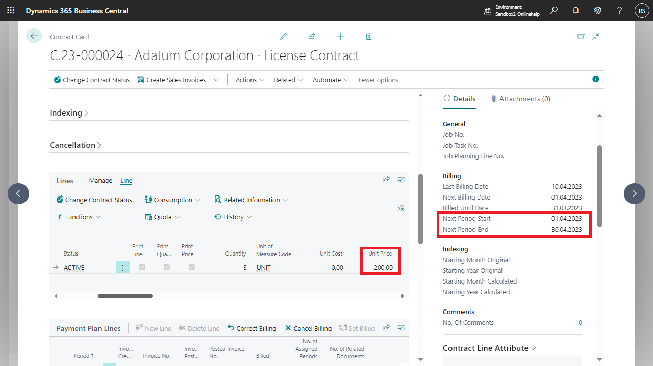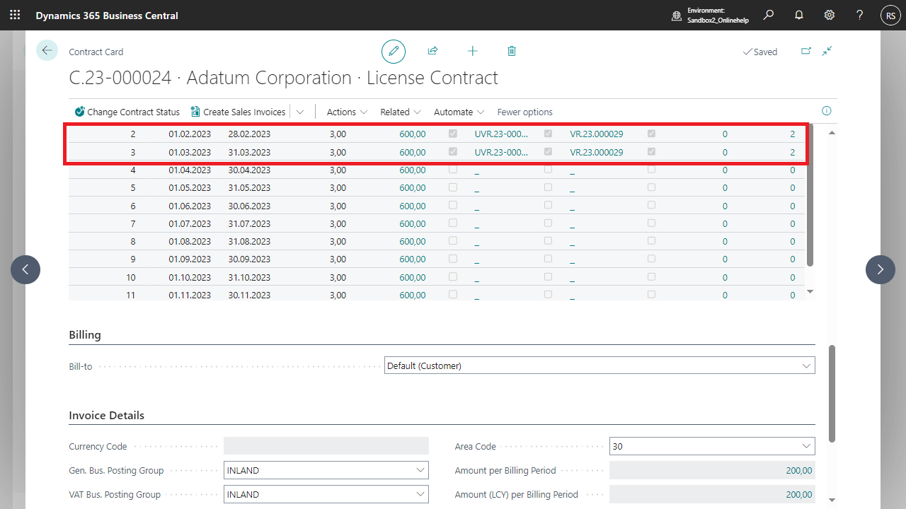 The unit price has been increased from 100 to 200 in period 2, which results in an increase in the line amount and thus triggers a sales invoice.