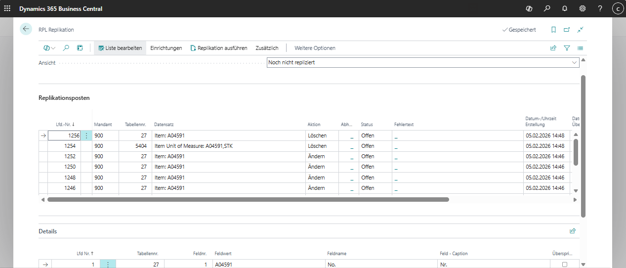 Bei Neuanlage eines Datensatzes wird ein Einfügen-Posten erstellt, mit welchem der Primärschlüssel im jeweiligen Zielmandanten angelegt wird. In manchen Situationen kann es vorkommen, dass der Einfügen-Posten nicht erstellt wird. In diesem Fall wird der Datensatz dann automatisch mit dem Ändern-Posten auch angelegt. Mit dem Ändern-Posten werden die restlichen Felder befüllt bzw. bei fehlendem Einfügen-Posten der Datensatz angelegt (beachten Sie, dass dann alle Felder laut Einrichtung einmalig ausgerollt werden). Das Löschen eines Tabellendatensatzes erzeugt einen Löschen-Posten. Jeder Posten enthält Detailzeilen mit den Informationen bezüglich der einzelnen Felder. Durch Klick auf "Replikationsposten" bzw. "Details" können Sie diese Zeilen jeweils aus- und einblenden.